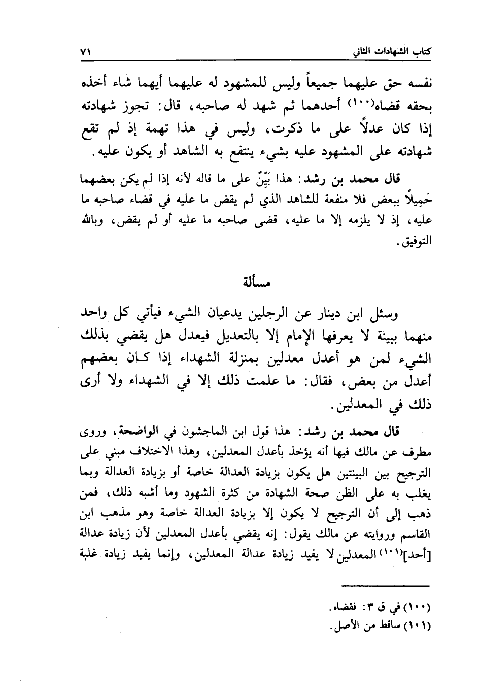 مسألة وسئل ابن دينار: عن الرجلين يدعيان الشيء فيأتي كل واحد منهما ببينة لا يعرفها الإمام إلا بالتعديل فيعدل هل يقضي بذلك الشيء لمن هو أعدل معدلين بمنزلة الشهداء إذا كان بعضهم أعدل من بعض، فقال: ما علمت ذلك إلا في الشهداء ولا أرى ذلك في المعدلين.