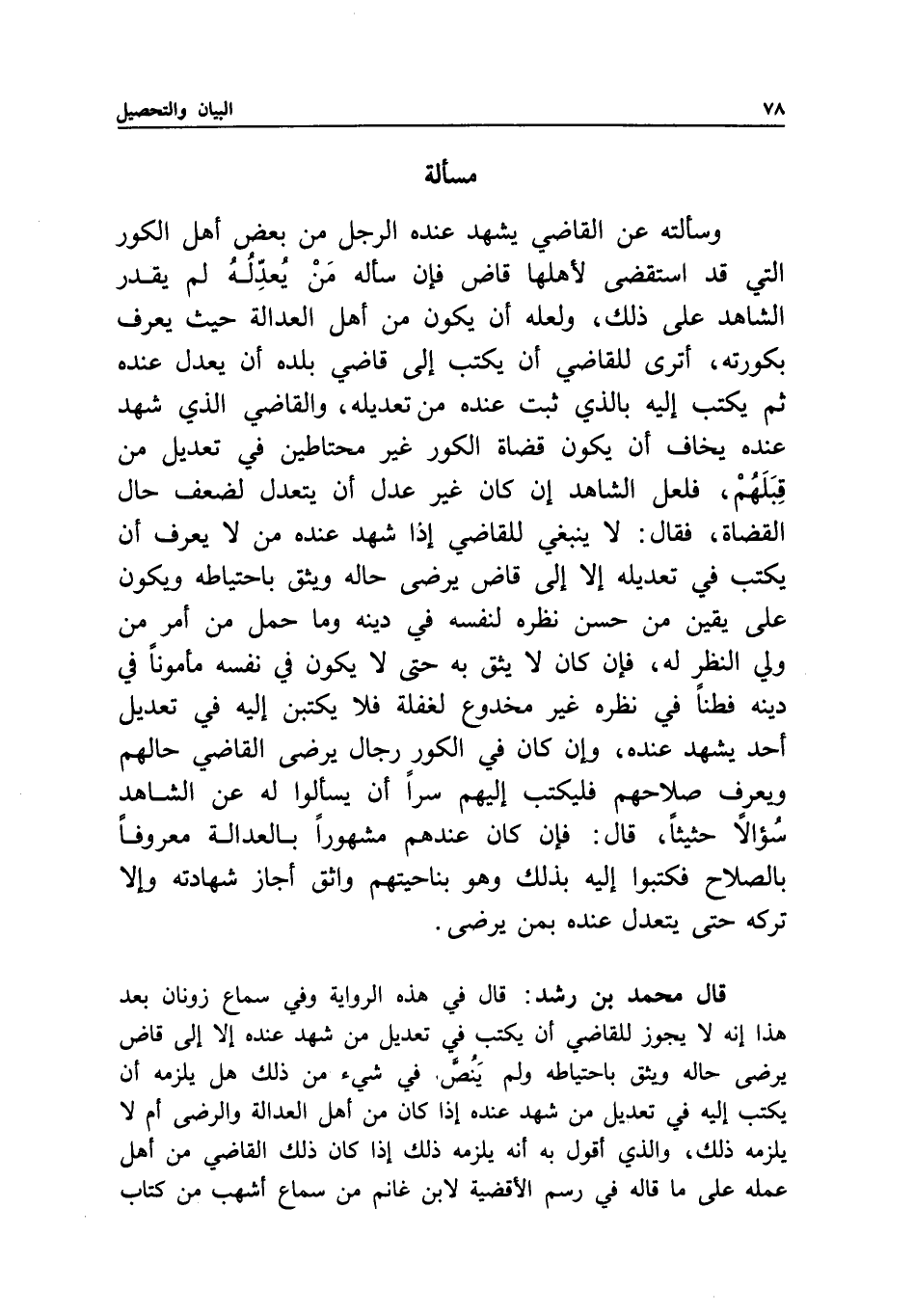 قال محمد بن رشد: قال في هذه الرواية وفي سماع زونان بعد هذا إنه لا يجوز للقاضي أن يكتب في تعديل من شهد عنده إلا إلى قاض يرضى حاله ويثق باحتياطه ولم ينص في شيء من ذلك هل يلزمه أن يكتب إليه في تعديل من شهد عنده إذا كان من أهل العدالة والرضى أم لا يلزمه ذلك، والذي أقول به أنه يلزمه ذلك إذا كان ذلك القاضي من أهل عمله على ما قاله في رسم الأقضية لابن غانم من سماع أشهب من كتاب