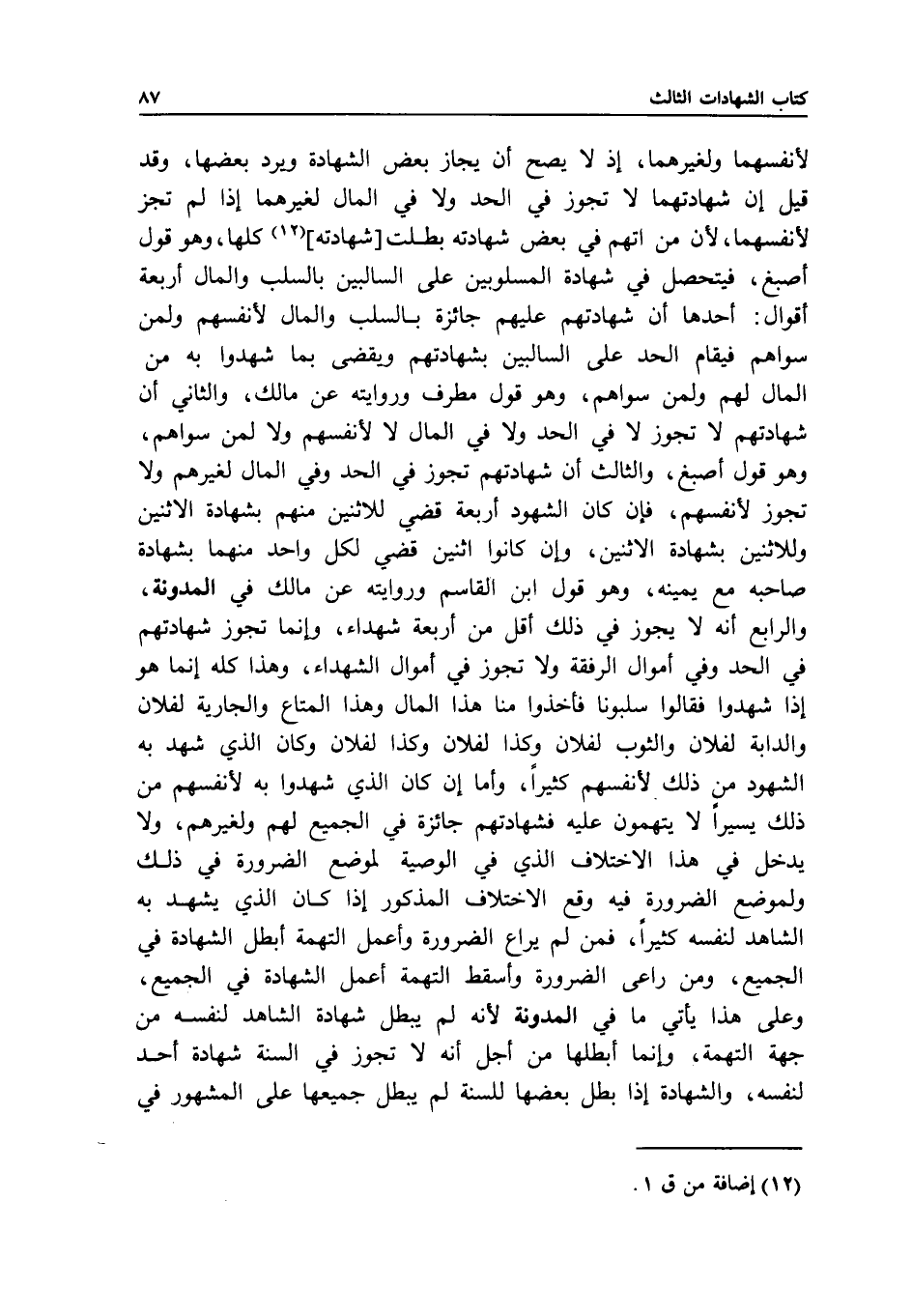 والثالث: أن شهادتهم تجوز في الحد وفي المال لغيرهم ولا تجوز لأنفسهم، فإن كان الشهود أربعة قضي للاثنين منهم بشهادة الاثنين وللاثنين بشهادة الاثنين، وإن كانوا اثنين قضي لكل واحد منهما بشهادة صاحبه مع يمينه، وهو قول ابن القاسم وروايته عن مالك في المدونة.