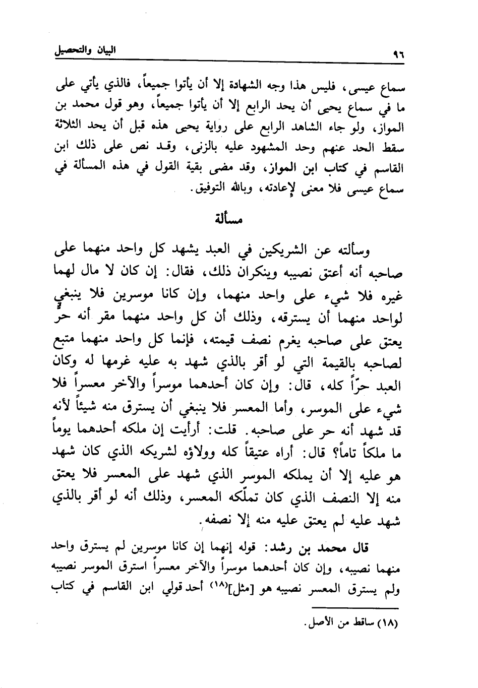 مسألة وسألته: عن الشريكين في العبد يشهد كل واحد منهما على صاحبه أنه أعتق نصيبه وينكران ذلك، فقال: إن كان لا مال لهما غيره فلا شيء على واحد منهما، وإن كانا موسرين فلا ينبغي لواحد منهما أن يسترقه، وذلك أن كل واحد منهما مقر أنه حر يعتق على صاحبه يغرم نصف قيمته، فإنما كل واحد منهما متبع لصاحبه بالقيمة التي لو أقر بالذي شهد به عليه غرمها له وكان العبد حرا كله، قال: وإن كان أحدهما موسرا والآخر معسرا فلا شيء على الموسر، وأما المعسر فلا ينبغي أن يسترق منه شيئا؛ لأنه قد شهد أنه حر على صاحبه، قلت: أرأيت إن ملكه أحدهما يوما ما ملكا تاما؟ قال: أراه عتيقا كله وولاؤه لشريكه الذي كان شهد هو عليه إلا أن يملكه الموسر الذي شهد على المعسر فلا يعتق منه إلا النصف الذي كان تملكه المعسر، وذلك أنه لو أقر بالذي شهد عليه لم يعتق عليه منه إلا نصفه.