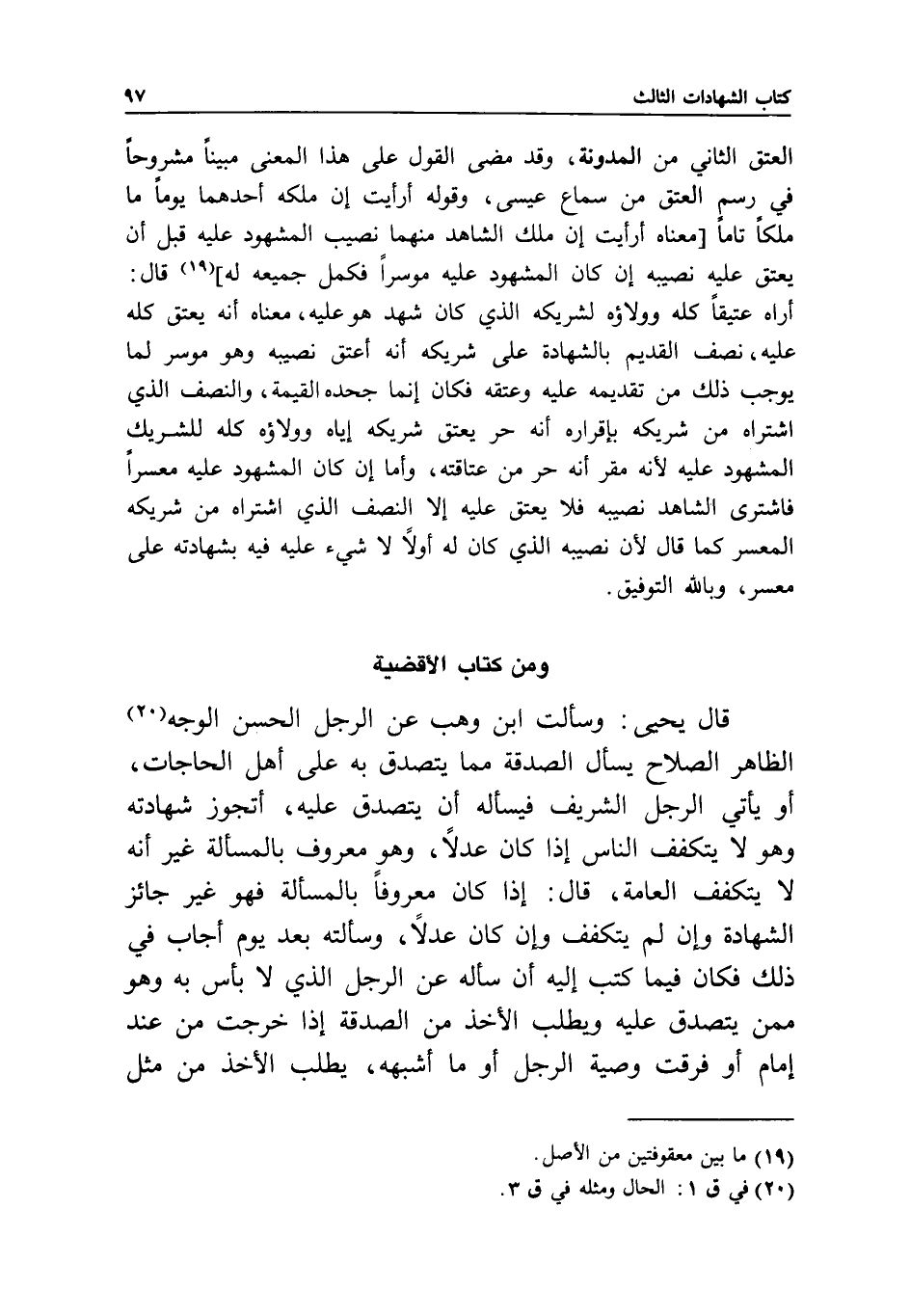 ومن كتاب الأقضية قال يحيى: وسألت ابن وهب عن الرجل الحسن الوجه الظاهر الصلاح يسأل الصدقة مما يتصدق به على أهل الحاجات، أو يأتي الرجل الشريف فيسأله أن يتصدق عليه، أتجوز شهادته وهو لا يتكفف الناس إذا كان عدلا، وهو معروف بالمسألة غير أنه لا يتكفف العامة، قال: إذا كان معروفا بالمسألة فهو غير جائز الشهادة، وإن لم يتكفف وإن كان عدلا، وسألته بعد يوم أجاب في ذلك فكان فيما كتب إليه أن سأله عن الرجل الذي لا بأس به وهو ممن يتصدق عليه ويطلب الأخذ من الصدقة إذا خرجت من عند إمام أو فرقت وصية الرجل أو ما أشبهه، يطلب الأخذ من مثل