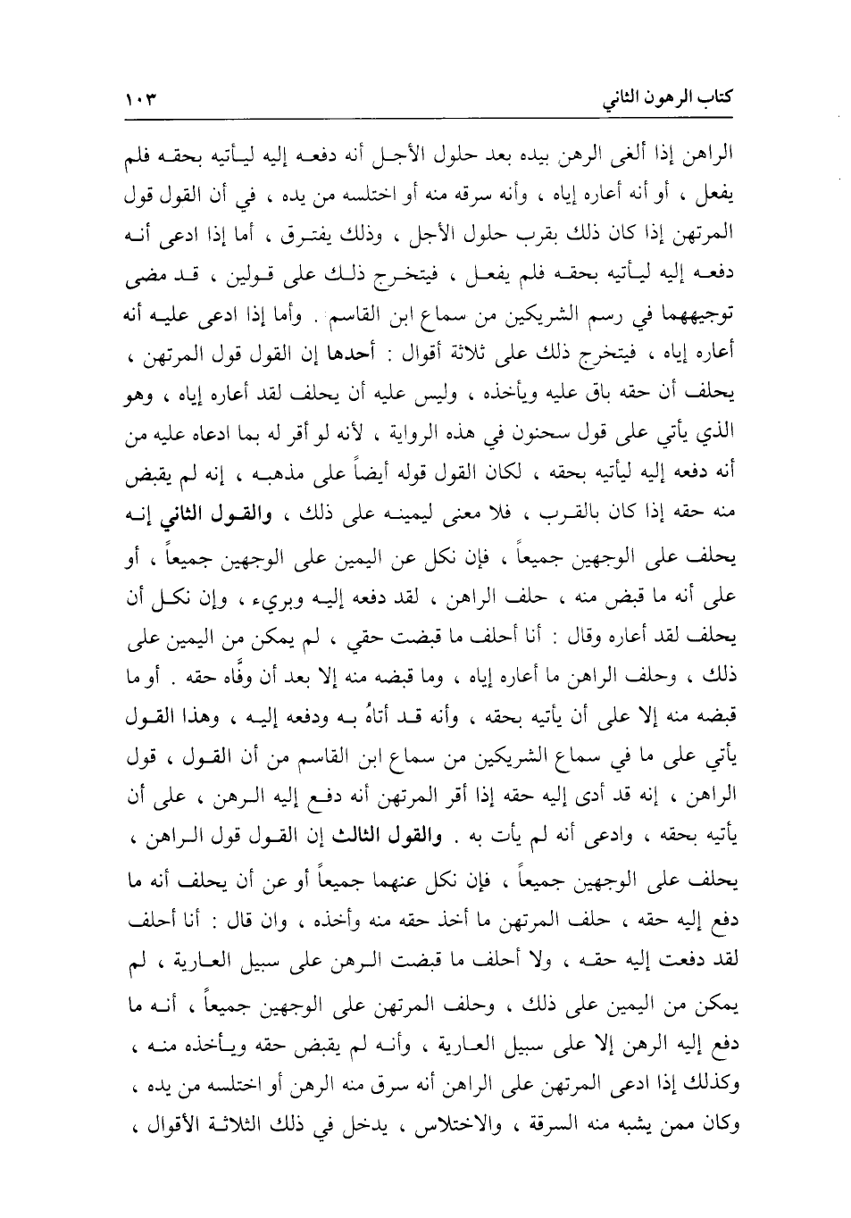 والقول الثالث: إن القول قول الراهن، يحلف على الوجهين جميعا، فإن نكل عنهما جميعا أو عن أن يحلف أنه ما دفع إليه حقه، حلف المرتهن ما أخذ حقه منه وأخذه، وإن قال: أنا أحلف لقد دفعت إليه حقه، ولا أحلف ما قبضت الرهن على سبيل العارية، لم يمكن من اليمين على ذلك، وحلف المرتهن على الوجهين جميعا، أنه ما دفع إليه الرهن إلا على سبيل العارية، وأنه لم يقبض حقه ويأخذه منه، وكذلك إذا ادعى المرتهن على الراهن أنه سرق منه الرهن أو اختلسه من يده، وكان ممن يشبه منه السرقة، والاختلاس، يدخل في ذلك الثلاثة الأقوال،