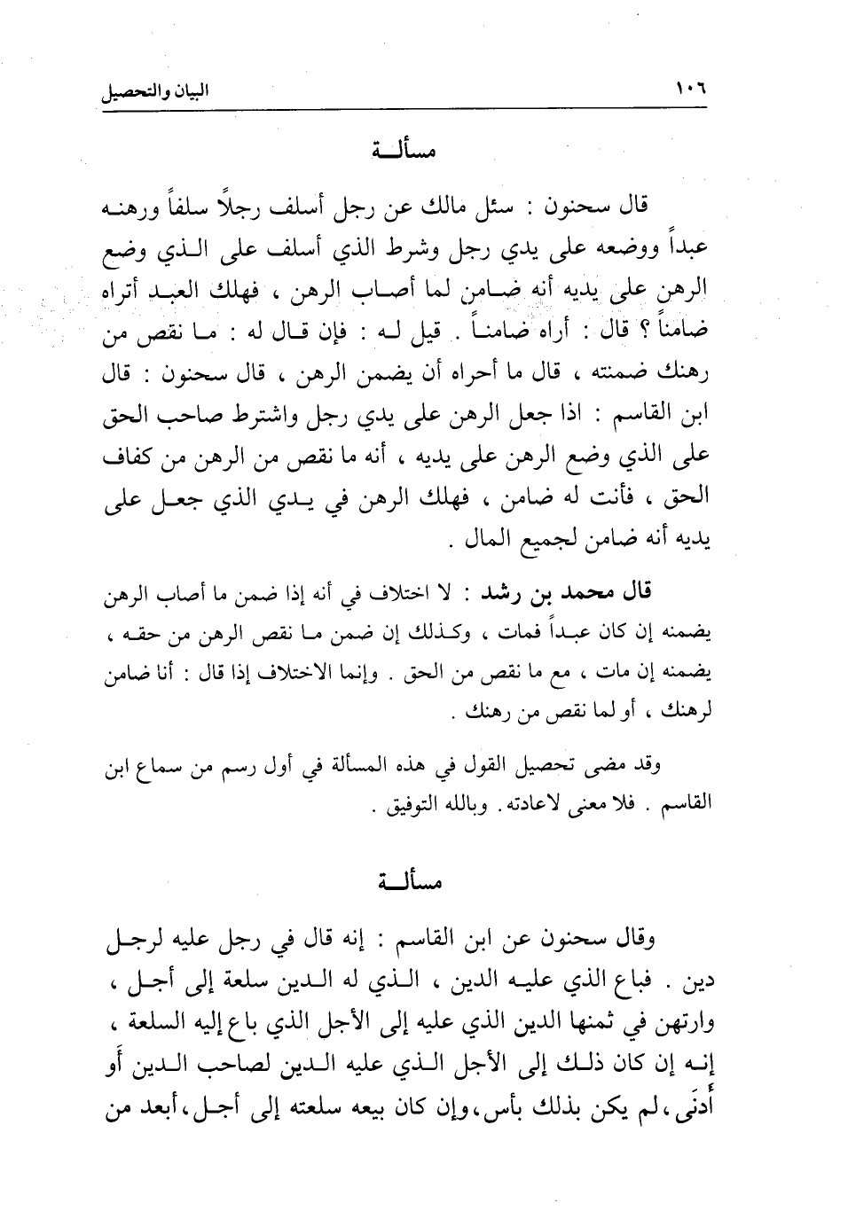مسألة قال سحنون: سئل مالك عن رجل أسلف رجلا سلفا ورهنه عبدا ووضعه على يدي رجل وشرط الذي أسلف على الذي وضع الرهن على يديه أنه ضامن لما أصاب الرهن، فهلك العبد أتراه ضامنا؟ قال: أراه ضامنا. قيل له: فإن قال له: ما نقص من رهنك ضمنته، قال ما أراه أن يضمن الرهن، قال سحنون: قال ابن القاسم: إذا جعل الرهن على يدي رجل واشترط صاحب الحق على الذي وضع الرهن على يديه، أنه ما نقص من الرهن من كفاف الحق، فأنت له ضامن، فهلك الرهن في يدي الذي جعل على يديه أنه ضامن لجميع المال.