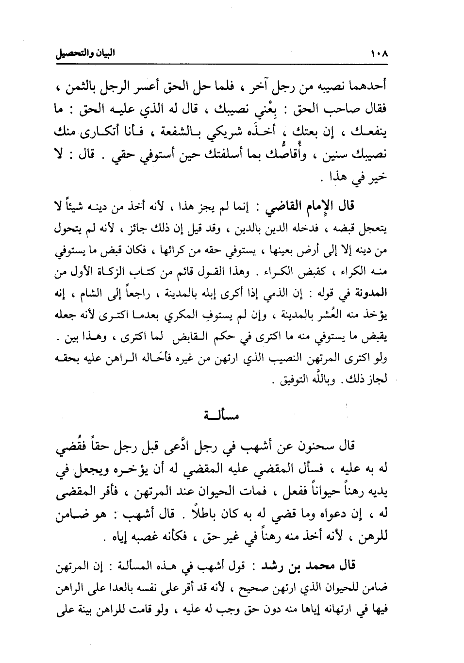 مسألة قال سحنون عن أشهب في رجل ادعى قبل رجل حقا فقضي له به عليه، فسأل المقضي عليه المقضي له أن يؤخره ويجعل في يديه رهنا حيوانا ففعل، فمات الحيوان عند المرتهن، فأقر المقضي له، إن دعواه وما قضي له به كان باطلا. قال أشهب: هو ضامن للرهن؛ لأنه أخذ منه رهنا في غير حق، فكأنه غصبه إياه.