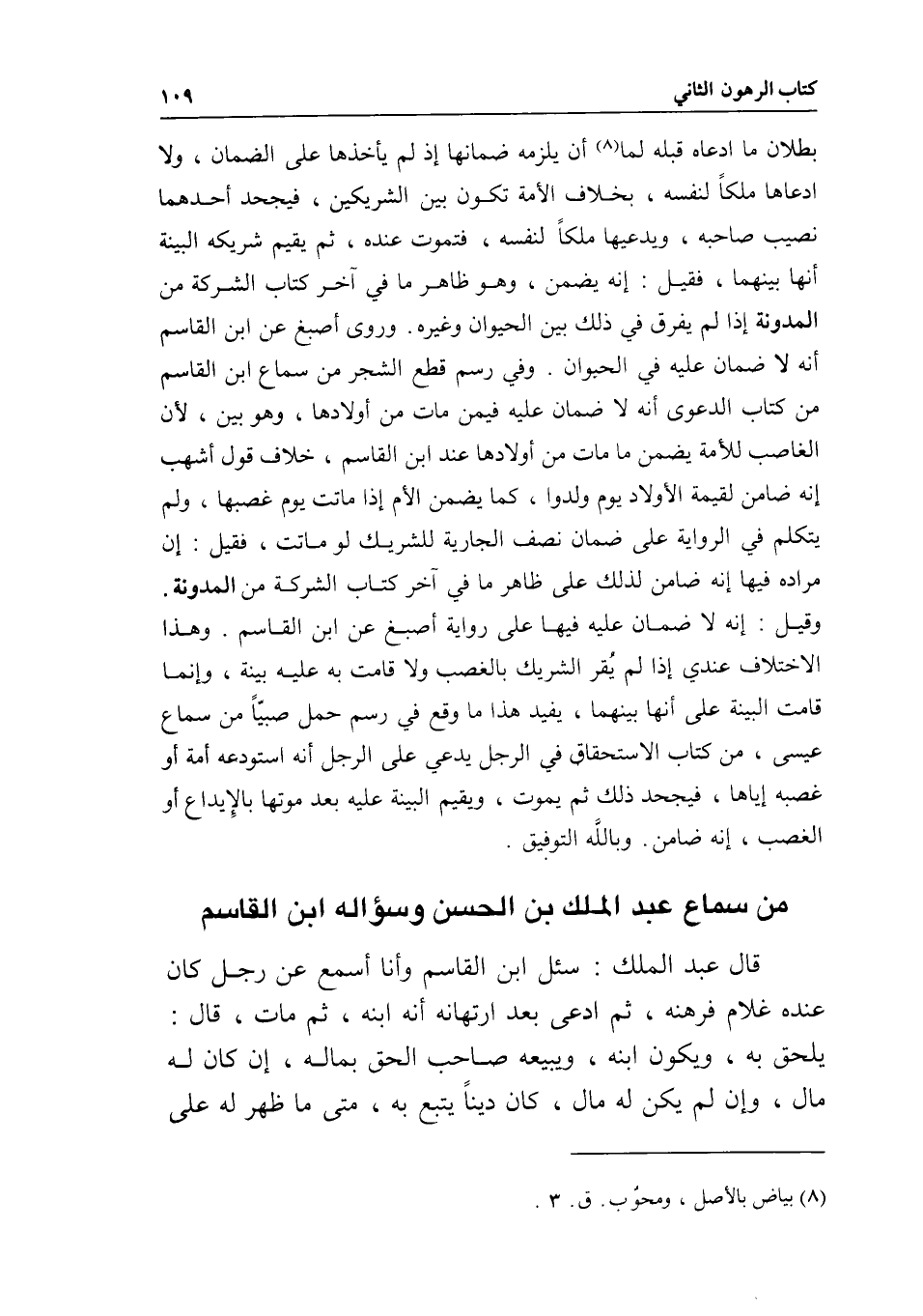 من سماع عبد الملك بن الحسن وسؤاله ابن القاسم قال عبد الملك: سئل ابن القاسم وأنا أسمع عن رجل كان عنده غلام فرهنه، ثم ادعى بعد ارتهانه أنه ابنه، ثم مات، قال: يلحق به، ويكون ابنه، ويبيعه صاحب الحق بماله، إن كان له مال، وإن لم يكن له مال، كان دينا يتبع به، متى ما ظهر له على