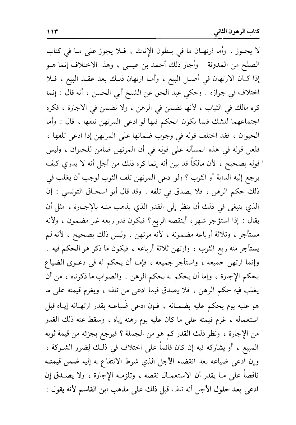 لا يجوز، وأما ارتهان ما في بطون الإناث، فلا يجوز على ما في كتاب الصلح من المدونة. وأجاز ذلك أحمد بن عيسى، وهذا الاختلاف إنما هو إذا كان الارتهان في أصل البيع، وأما ارتهان ذلك بعد عقد البيع، فلا اختلاف في جوازه. وحكى عبد الحق عن الشيخ أبي الحسن، أنه قال: إنما كره مالك في الثياب؛ لأنها تضمن في الرهن، ولا تضمن في الإجارة، فكره اجتماعهما للشك فيما يكون الحكم فيها لو ادعى المرتهن تلفها، قال: وأما الحيوان، فقد اختلف قوله في وجوب ضمانها على المرتهن إذا ادعى تلفها، فلعل قوله في هذه المسألة على قوله في أن المرتهن ضامن للحيوان، وليس قوله بصحيح؛ لأن مالكا قد بين أنه إنما كره ذلك من أجل أنه لا يدري كيف يرجع إليه الدابة أو الثوب؟ ولو ادعى المرتهن تلف الثوب لوجب أن يغلب في ذلك حكم الرهن، فلا يصدق في تلفه. وقد قال أبو إسحاق التونسي: إن الذي ينبغي في ذلك أن ينظر إلى القدر الذي يذهب منه بالإجارة، مثل أن يقال: إذا استؤجر شهر، أينقصه الربع؟ فيكون قدر ربعه غير مضمون، ولأنه مستأجر، وثلاثة أرباعه مضمونة؛ لأنه مرتهن، وليس ذلك بصحيح؛ لأنه لم يستأجر منه ربع الثوب، وارتهن ثلاثة أرباعه، فيكون ما ذكر هو الحكم فيه. وإنما ارتهن جميعه، واستأجر جميعه، فإما أن يحكم له في دعوى الضياع بحكم الإجارة، وإما أن يحكم له بحكم الرهن. والصواب ما ذكرناه، من أن يغلب فيه حكم الرهن، فلا يصدق فيما ادعى من تلفه، ويغرم قيمته على ما هو عليه يوم يحكم عليه بضمانه، فإن ادعى ضياعه بقدر ارتهانه إياه قبل استعماله، غرم قيمته على ما كان عليه يوم رهنه إياه، وسقط عنه ذلك القدر من الإجارة، ونظر ذلك القدر كم هو من الجملة؟ فيرجع بجزئه من قيمة ثوبه المبيع، أو يشاركه فيه إن كان قائما على اختلاف في ذلك لضرر الشركة، وإن ادعى ضياعه بعد انقضاء الأجل الذي شرط الانتفاع به إليه ضمن قيمته ناقصا على ما يقدر أن الاستعمال نقصه، وتلزمه الإجارة، ولا يصدق إن ادعى بعد حلول الأجل أنه تلف قبل ذلك على مذهب ابن القاسم لأنه يقول: