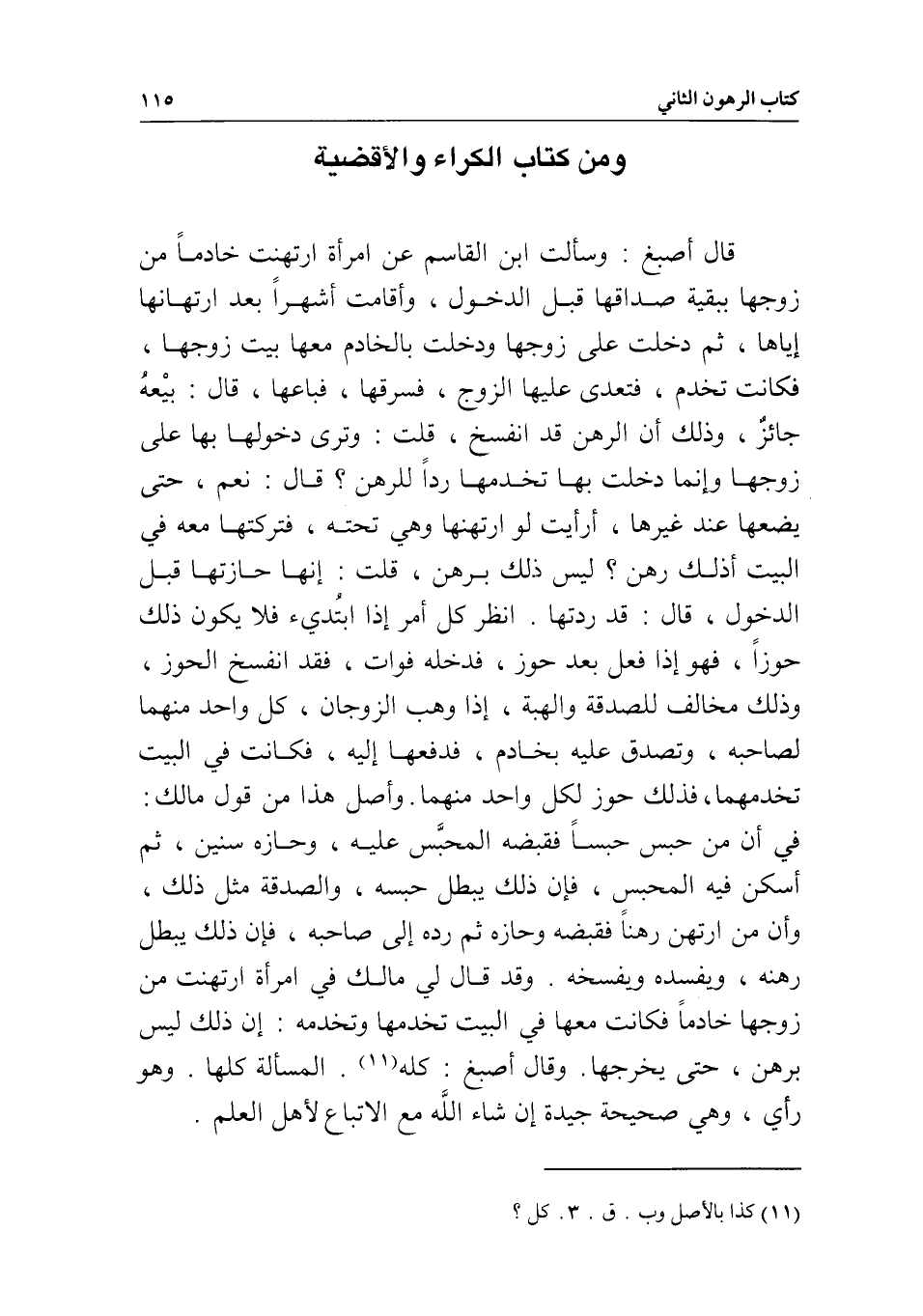 ومن كتاب الكراء والأقضية قال أصبغ: وسألت ابن القاسم عن امرأة ارتهنت خادما من زوجها ببقية صداقها قبل الدخول، وأقامت أشهرا بعد ارتهانها إياها، ثم دخلت على زوجها ودخلت بالخادم معها بيت زوجها، فكانت تخدم، فتعدى عليها الزوج، فسرقها، فباعها، قال: بيعه جائز، وذلك أن الرهن قد انفسخ، قلت: وترى دخولها بها على زوجها، وإنما دخلت بها تخدمها ردا للرهن؟ قال: نعم، حتى يضعها عند غيرها، أرأيت لو ارتهنتها وهي تحته، فتركتها معه في البيت أذلك رهن؟ ليس ذلك برهن، قلت: إنها حازتها قبل الدخول، قال: قد ردتها. انظر كل أمر إذا ابتدئ فلا يكون ذلك حوزا، فهو إذا فعل بعد حوز، فدخله فوات، فقد انفسخ الحوز، وذلك مخالف للصدقة والهبة، إذا وهب الزوجان، كل واحد منهما لصاحبه، وتصدق عليه بخادم، فدفعها إليه، فكانت في البيت تخدمهما، فذلك حوز لكل واحد منهما. وأصل هذا من قول مالك: في أن من حبس حبسا فقبضه المحبس عليه، وحازه سنين، ثم أسكن فيه المحبس، فإن ذلك يبطل حبسه، والصدقة مثل ذلك، وأن من ارتهن رهنا فقبضه وحازه ثم رده إلى صاحبه، فإن ذلك يبطل رهنه، ويفسده ويفسخه. وقد قال لي مالك في امرأة ارتهنت من زوجها خادما فكانت معها في البيت تخدمها وتخدمه: إن ذلك ليس برهن، حتى يخرجها. وقال أصبغ: كله المسألة كلها، وهو رأي، وهي صحيحة جيدة - إن شاء الله - مع الاتباع لأهل العلم.