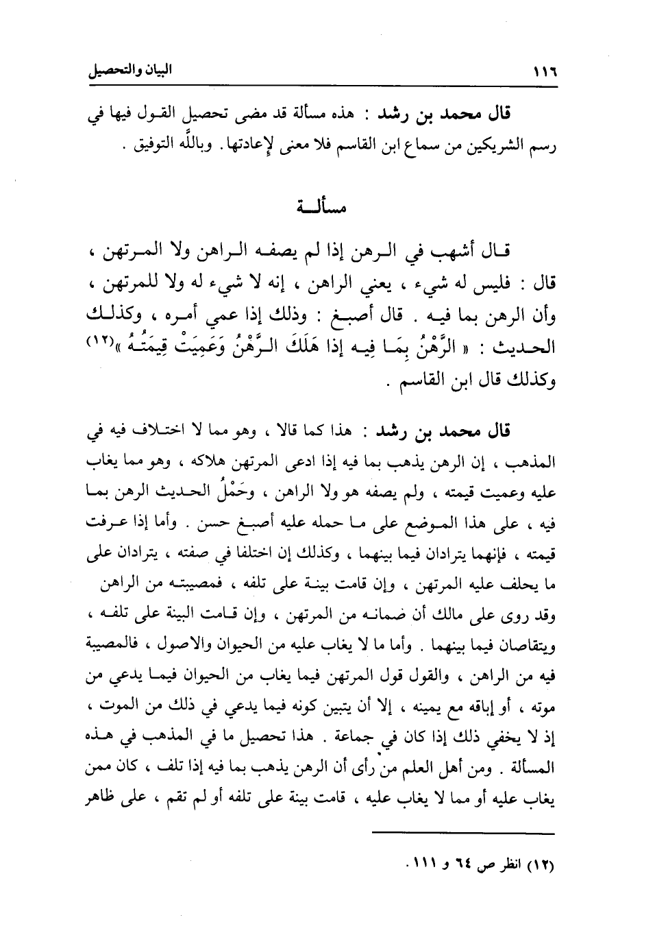 قال محمد بن رشد: هذا كما قالا، وهو مما لا اختلاف فيه في المذهب، إن الرهن يذهب بما فيه إذا ادعى المرتهن هلاكه، وهو مما يغاب عليه وعميت قيمته، ولم يصفه هو ولا الراهن، وحمل الحديث «الرهن بما فيه» ، على هذا الموضع على ما حمله عليه أصبغ حسن. وأما إذا عرفت قيمته، فإنهما يترادّان فيما بينهما، وكذلك إن اختلفا في صفته، يترادان على ما يحلف عليه المرتهن، وإن قامت بينة على تلفه، فمصيبته من الراهن وقد روى عن مالك أن ضمانه من المرتهن، وإن قامت البينة على تلفه، ويتقاصان فيما بينهما. وأما ما لا يغاب عليه من الحيوان والأصول، فالمصيبة فيه من الراهن، والقول قول المرتهن فيما يغاب من الحيوان فيما يدعي من موته، أو إباقه مع يمينه، إلا أن يتبين كونه فيما يدعي في ذلك من الموت؛ إذ لا يخفى ذلك إذا كان في جماعة. هذا تحصيل ما في المذهب في هذه المسألة. ومن أهل العلم من رأى أن الرهن يذهب بما فيه إذا تلف، كان مما يغاب عليه أو مما لا يغاب عليه، قامت بينة على تلفه أو لم تقم، على ظاهر