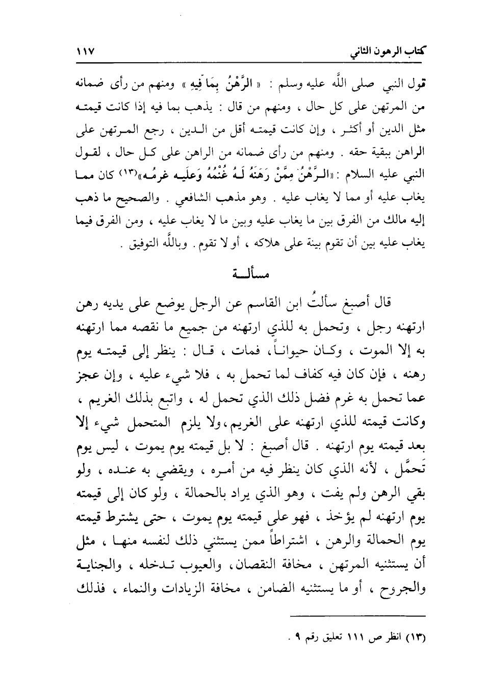 قول النبي - صَلَّى اللَّهُ عَلَيْهِ وَسَلَّمَ -: «الرهن بما فيه» ومنهم من رأى ضمانه من المرتهن على كل حال، ومنهم من قال: يذهب بما فيه إذا كانت قيمته مثل الدين أو أكثر، وإن كانت قيمته أقل من الدين، رجع المرتهن على الراهن ببقية حقه. ومنهم من رأى ضمانه من الراهن على كل حال؛ لقول النبي - عَلَيْهِ السَّلَامُ -: «الرهن ممن رهنه له غنمه وعليه غرمه» كان مما يغاب عليه أو مما لا يغاب عليه. وهو مذهب الشافعي. والصحيح ما ذهب إليه مالك من الفرق بين ما يغاب عليه وبين ما لا يغاب عليه، ومن الفرق فيما يغاب عليه بين أن تقوم بينة على هلاكه، أو لا تقوم. وبالله التوفيق.