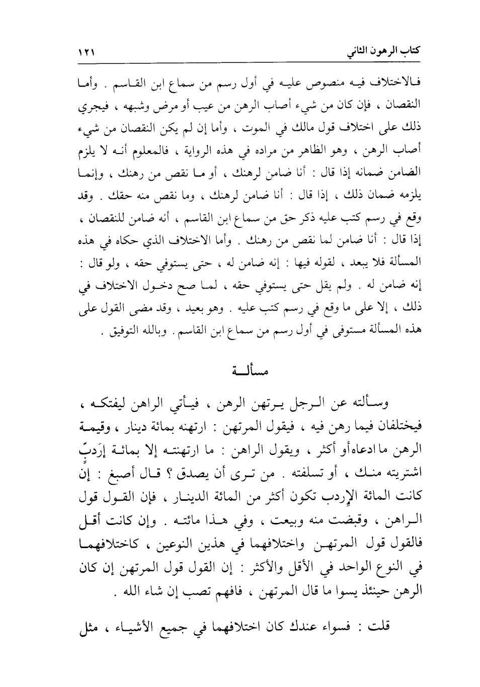 مسألة وسألته عن الرجل يرتهن الرهن، فيأتي الراهن ليفتكه، فيختلفان فيما رهن فيه، فيقول المرتهن: ارتهنتُه بمائة دينار، وقيمة الرهن ما ادعاه أو أكثر، ويقول الراهن: ما ارتهنتَه إلا بمائة إردب اشتريته منك، أو تسلفته. من ترى أن يصدق؟ قال أصبغ: إن كانت المائة الإردب تكون أكثر من المائة الدينار، فإن القول قول الراهن، وقبضت منه وبيعت، وفي هذا مائته. وإن كانت أقل فالقول قول المرتهن واختلافهما في هذين النوعين، كاختلافهما في النوع الواحد في الأقل والأكثر: إن القول قول المرتهن إن كان الرهن حينئذ يسوى ما قال المرتهن، فافهم تصب إن شاء الله.