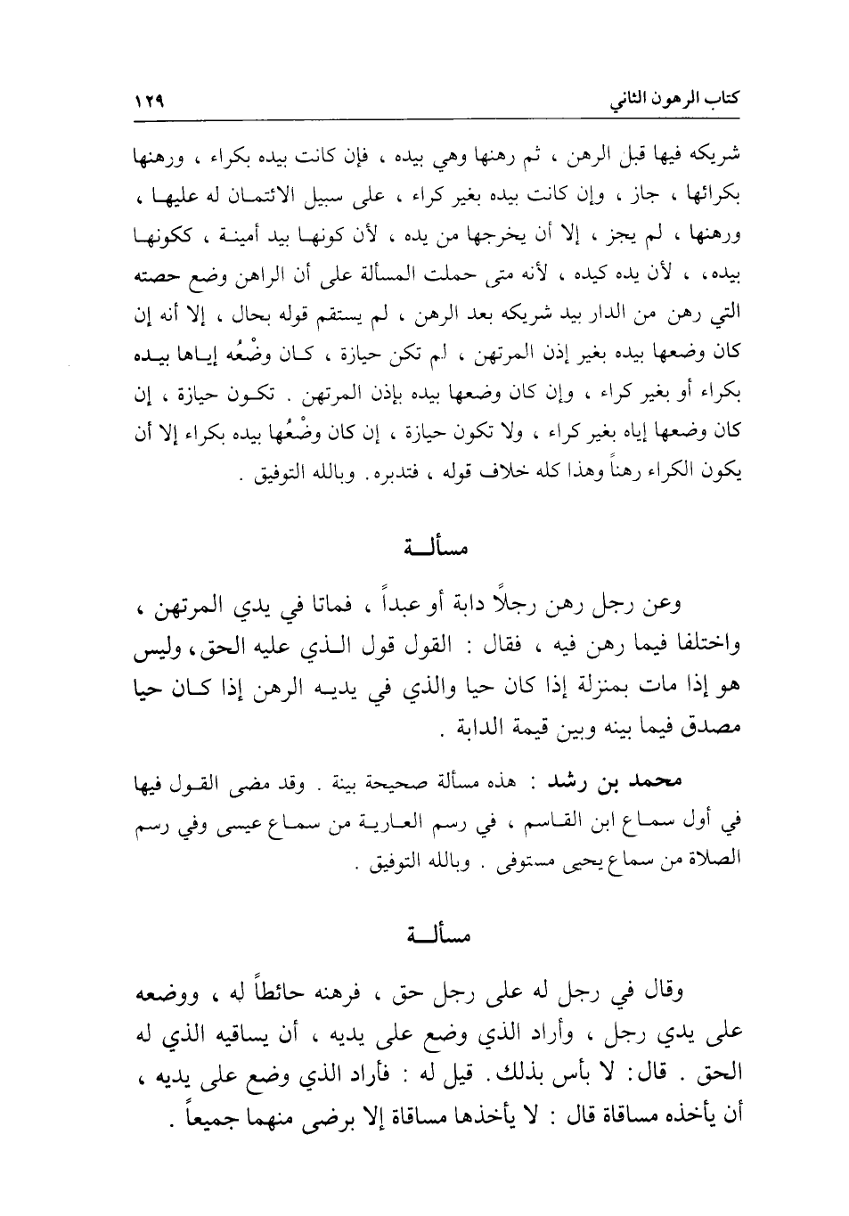 محمد بن رشد: هذه مسألة صحيحة بينة، وقد مضى القول فيها في أول سماع ابن القاسم، في رسم العارية، من سماع عيسى، وفي رسم الصلاة، من سماع يحيى مستوفى، وبالله التوفيق.