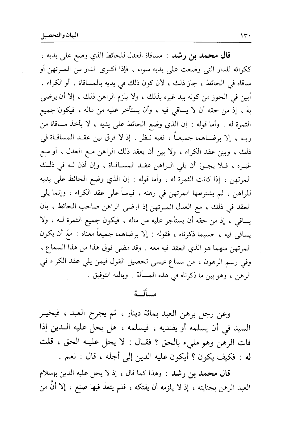 وأما قوله: إن الذي وضع الحائط على يديه، لا يأخذ مساقاة من ربه، إلا برضاهما جميعا، ففيه نظر؛ إذ لا فرق بين عقد المساقاة في ذلك، وبين عقد الكراء، ولا بين أن يعقد ذلك الراهن بالعدل، أو مع غيره، فلا يجوز أن يلي الراهن عقد المساقاة، وإن أذن له في ذلك المرتهن؛ إذا كانت الثمرة له، وأما قوله: إن الذي وضع الحائط على يديه للراهن، لم يشترطها المرتهن في رهنه، قياسا على عقد الكراء، وإنما يلي العقد في ذلك، مع العدل المرتهن إذ أرضى الراهن صاحب الحائط، بأن يساقي؛ إذ من حقه أن يستأجر عليه من ماله، فيكون جميع الثمرة له، ولا يساقي فيه، حسبما ذكرناه، فقوله: إلا برضاهما جميعا معناه: مع أن يكون المرتهن منهما هو الذي العقد فيه معه، وقد مضى فوق هذا من هذا السماع، وفي رسم الرهون، من سماع عيسى تحصيل القول فيمن يلي عقد الكراء في الرهن، وهو بين ما ذكرناه في هذه المسألة، وبالله التوفيق.
