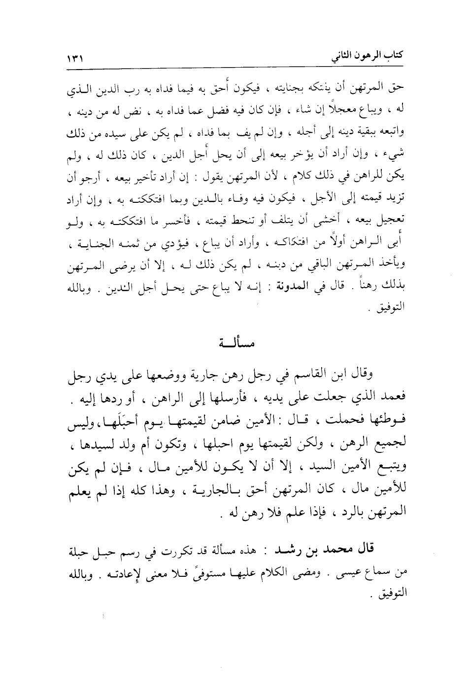 قال محمد بن رشد: هذه مسألة قد تكررت في رسم حبل حبلة من سماع عيسى، ومضى الكلام عليها مستوفى، فلا معنى لإعادته، وبالله التوفيق.