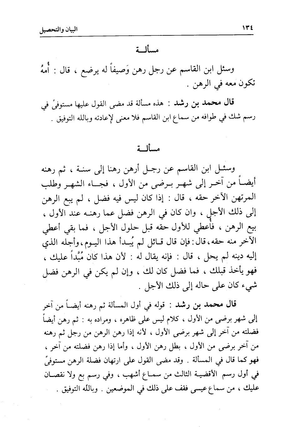 قال محمد بن رشد: قوله في أول المسألة: ثم رهنه أيضا من آخر إلى شهر برضا من الأول، كلام ليس على ظاهره، ومراده به: ثم رهن أيضا فضلته من آخر إلى شهر برضا الأول؛ لأنه إذا رهن الرهن من رجل ثم رهنه من آخر برضا من الأول، بطل رهن الأول، وأما إذا رهن فضلته من آخر، فهو كما قال في المسألة. وقد مضى القول على ارتهان فضلة الرهن مستوفى في أول رسم الأقضية الثالث، من سماع أشهب، وفي رسم بع ولا نقصان عليك، من سماع عيسى، فقف على ذلك في الموضعين، وبالله التوفيق.