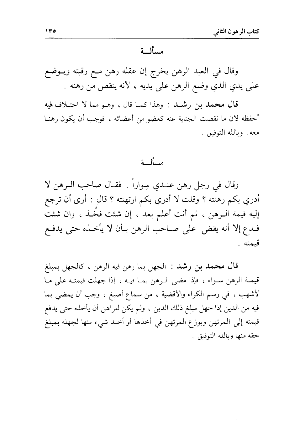 قال محمد بن رشد: الجهل بما رهن فيه الرهن، كالجهل بمبلغ قيمة الرهن سواء، فإذا مضى الرهن بما فيه؛ إذا جهلت قيمته على ما لأشهب، في رسم الكراء والأقضية من سماع أصبغ، وجب أن يمضي بما فيه من الدين إذا جهل مبلغ ذلك الدين، ولم يكن للراهن أن يأخذه حتى يدفع قيمته إلى المرتهن، ويوزع المرتهن في أخذها، أو أخذ شيء منها لجهله بمبلغ حقه منها، وبالله التوفيق.