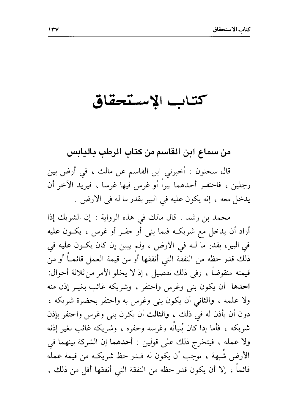 محمد بن رشد: قال مالك في هذه الرواية: إن الشريك إذا أراد أن يدخل مع شريكه فيما بنى أو حفر أو غرس، يكون عليه في البير بقدر ما له في الأرض، ولم يبين إن كان يكون عليه في ذلك قدر حظه من النفقة التي أنفقها، أو من قيمة العمل قائما، أو من قيمته منقوضا، وفي ذلك تفصيل؛ إذ لا يخلو الأمر من ثلاثة أحوال؛ أحدها: أن يكون بنى وغرس واحتفر، وشريكه غائب، بغير إذن منه ولا علمه. والثاني: أن يكون بنى وغرس به، واحتفر بحضرة شريكه، دون أن يأذن له في ذلك. والثالث: أن يكون بنى وغرس واحتفر بإذن شريكه، فأما إذا كان بنيانه وغرسه وحفره، وشريكه غائب بغير إذنه ولا عمله، فيتخرج ذلك على قولين؛ أحدهما: أن الشركة بينهما في الأرض شبهة، توجب أن يكون له قدر حظ شريكه من قيمة عمله قائما، إلا أن يكون قدر حظه من النفقة التي أنفقها أقل من ذلك،