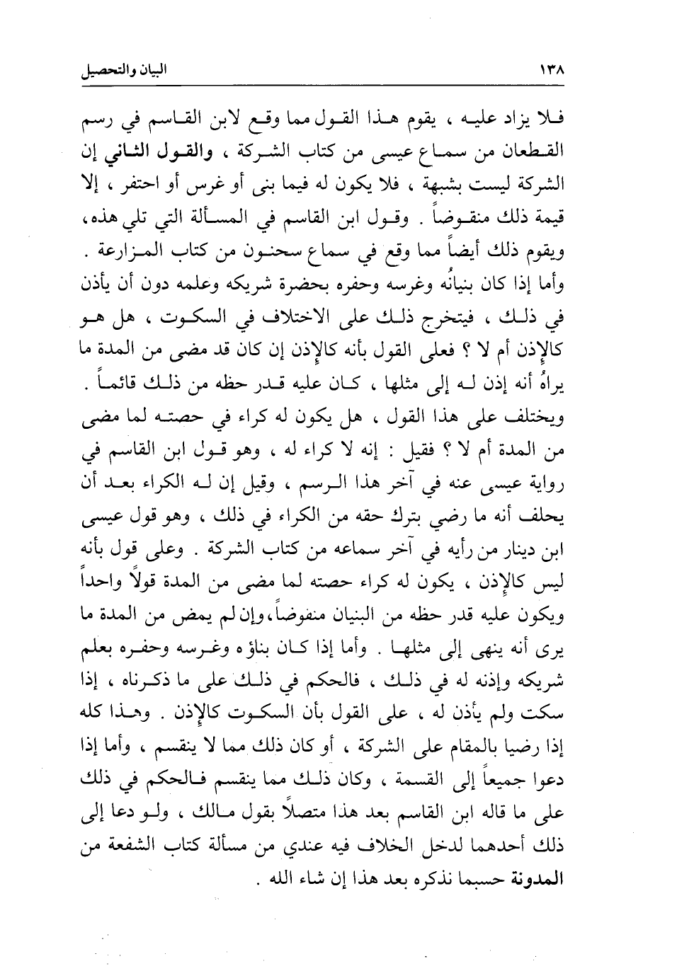 فلا يزاد عليه، يقوم هذا القول مما وقع لابن القاسم في رسم القطعان، من سماع عيسى، من كتاب الشركة. والقول الثاني: أن الشركة ليست بشبهة، فلا يكون له فيما بنى أو غرس أو احتفر، إلا قيمة ذلك منقوضا. وقول ابن القاسم في المسألة التي تلي هذه، ويقوم ذلك أيضا مما وقع في سماع سحنون، من كتاب المزارعة.