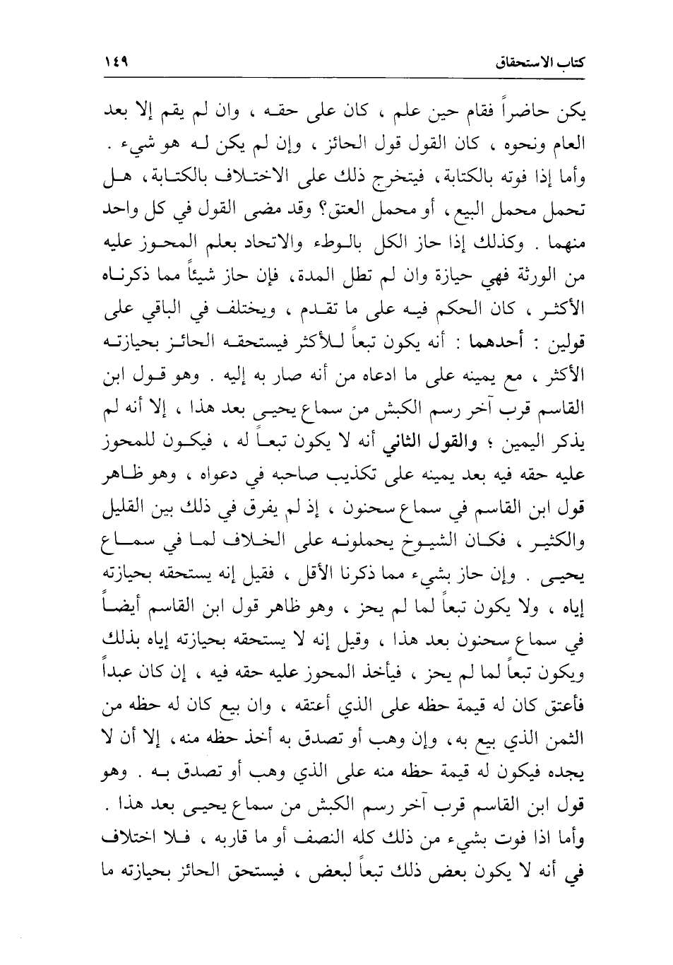 وأما إذا فوته بالكتابة، فيتخرج ذلك على الاختلاف بالكتابة، هل تحمل محمل البيع، أو محمل العتق؟ وقد مضى القول في كل واحد منهما، وكذلك إذا حاز الكل بالوطء والاتحاد بعلم المحوز عليه من الورثة فهي حيازة، وإن لم تطل المدة، فإن حاز شيئا مما ذكرناه الأكثر، كان الحكم فيه على ما تقدم، ويختلف في الباقي على قولين؛ أحدهما: أنه يكون تبعا للأكثر، فيستحقه الحائز بحيازته الأكثر، مع يمينه على ما ادعاه من أنه صار به إليه. وهو قول ابن القاسم قرب آخر رسم الكبش، من سماع يحيى بعد هذا، إلا أنه لم يذكر اليمين. والقول الثاني: أنه لا يكون تبعا له، فيكون للمحوز عليه حقه فيه بعد يمينه على تكذيب صاحبه في دعواه، وهو ظاهر قول ابن القاسم في سماع سحنون؛ إذ لم يفرق في ذلك بين القليل والكثير، فكان الشيوخ يحملونه على الخلاف لما في سماع يحيى.