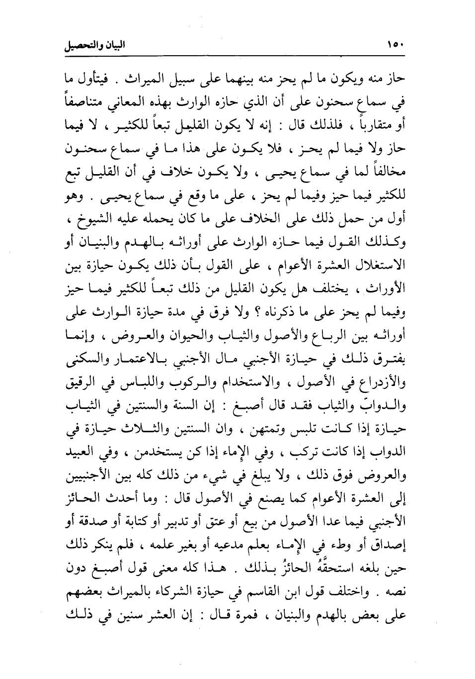 وهو أول من حمل ذلك على الخلاف على ما كان يحمله عليه الشيوخ، وكذلك القول فيما حازه الوارث على أوراثه بالهدم والبنيان، أو الاستغلال العشرة الأعوام، على القول بأن ذلك يكون حيازة بين الأوراث، يختلف هل يكون القليل من ذلك تبعا للكثير فيما حيز، وفيما لم يحز على ما ذكرناه، ولا فرق في مدة حيازة الوارث على أوراثه بين الرباع والأصول والثياب والحيوان والعروض، وإنما يفترق ذلك في حيازة الأجنبي مال الأجنبي بالاعتمار والسكنى والازدراع في الأصول، والاستخدام والركوب واللباس في الرقيق والدواب والثياب، فقد قال أصبغ: إن السنة والسنتين في الثياب حيازة إذا كانت تلبس وتمتهن، وإن السنتين والثلاث حيازة في الدواب إذا كانت تركب، وفي الإماء إذا كن يستخدمن، وفي العبيد والعروض فوق ذلك، ولا يبلغ في شيء من ذلك كله بين الأجنبيين إلى العشرة الأعوام كما يصنع في الأصول قال: وما أحدث الحائز الأجنبي فيما عدا الأصول من بيع أو عتق أو تدبير أو كتابة أو صدقة أو إصداق أو وطء في الإماء بعلم مدعيه أو بغير علمه، فلم ينكر ذلك حين بلغه استحقه الحائز بذلك.