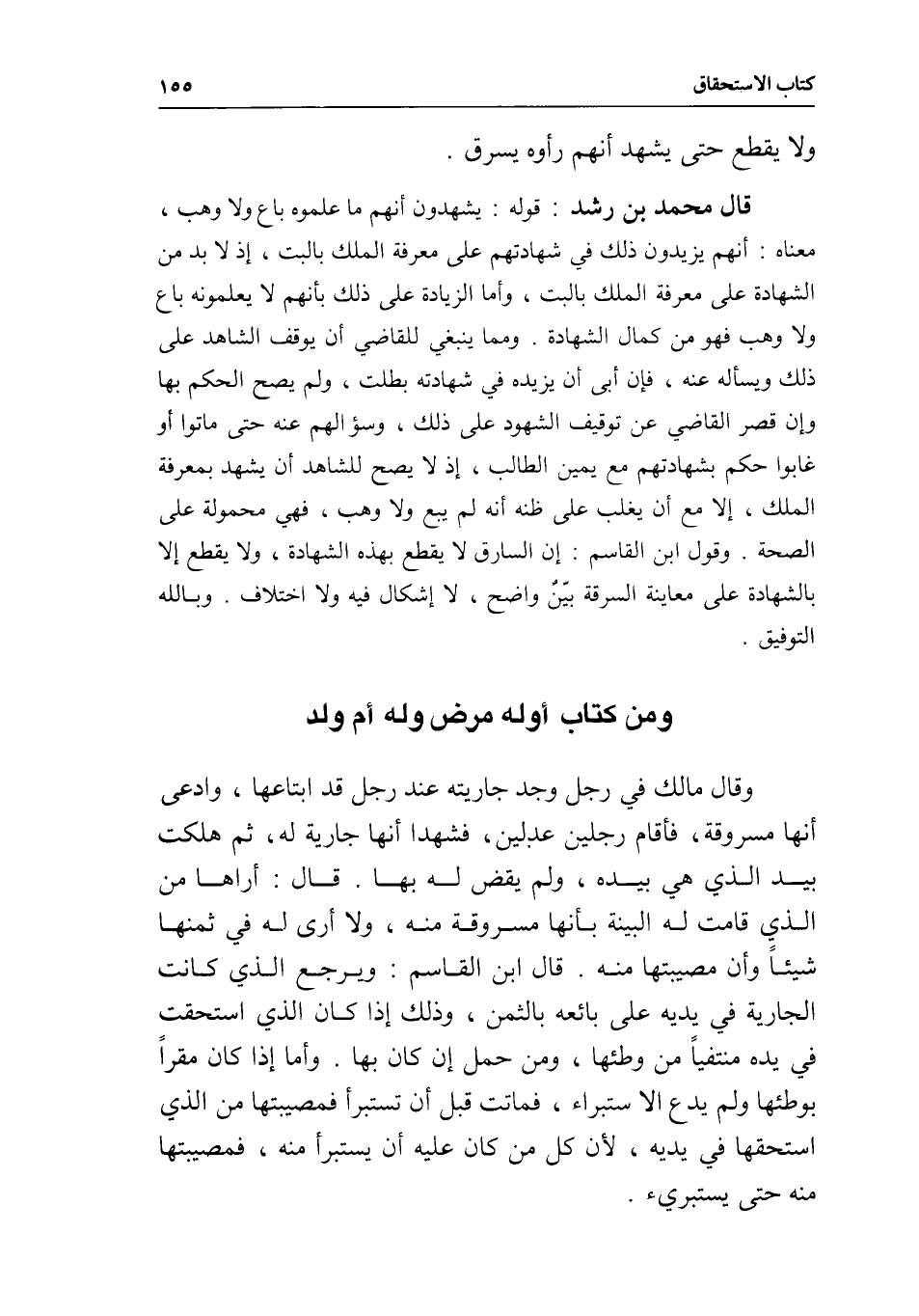 قال محمد بن رشد: قوله: يشهدون أنهم ما علموه باع ولا وهب، معناه: أنهم يزيدون ذلك في شهادتهم على معرفة الملك بالبت؛ إذ لا بد من الشهادة على معرفة الملك بالبت، وأما الزيادة على ذلك بأنهم لا يعلمونه باع ولا وهب، فهو من كمال الشهادة. ومما ينبغي للقاضي أن يوقف الشاهد على ذلك ويسأله عنه، فإن أبى أن يزيده في شهادته بطلت، ولم يصح الحكم بها، وإن قصر القاضي عن توقيف الشهود على ذلك، وسؤالهم عنه حتى ماتوا، أو غابوا حكم بشهادتهم مع يمين الطالب؛ إذ لا يصح للشاهد أن يشهد بمعرفة الملك، إلا مع أن يغلب على ظنه أنه لم يبع ولا وهب، فهي محمولة على الصحة. وقول ابن القاسم: إن السارق لا يقطع بهذه الشهادة، ولا يقطع إلا بالشهادة على معاينة السرقة بين واضح، لا إشكال فيه ولا اختلاف، وبالله التوفيق.