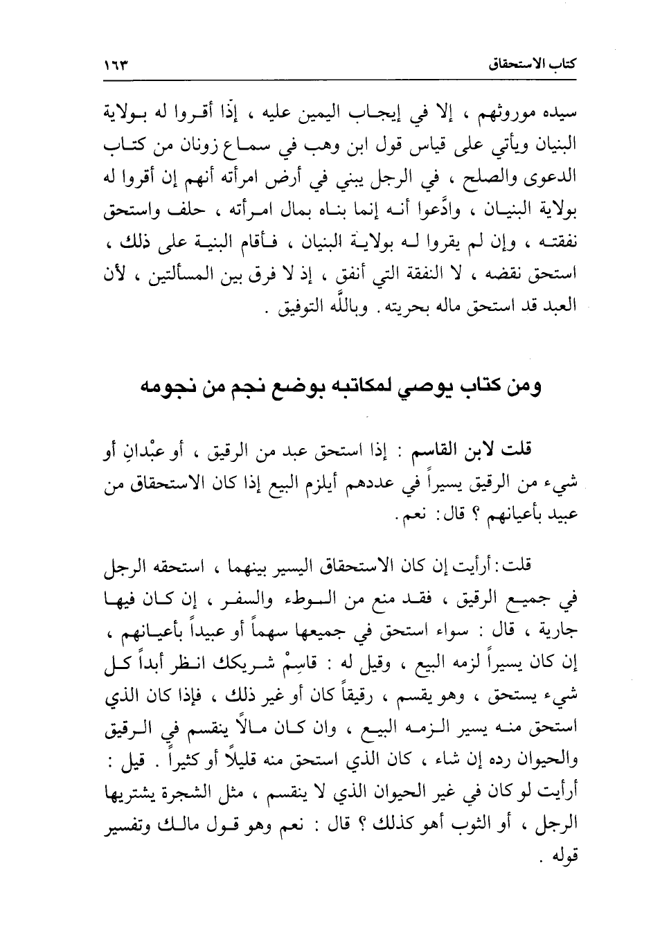 ومن كتاب يوصي لمكاتبه بوضع نجم من نجومه قلت لابن القاسم: إذا استحق عبد من الرقيق، أو عبدان أو شيء من الرقيق يسيرا في عددهم، أيلزم البيع إذا كان الاستحقاق من عبيد بأعيانهم؟ قال: نعم.