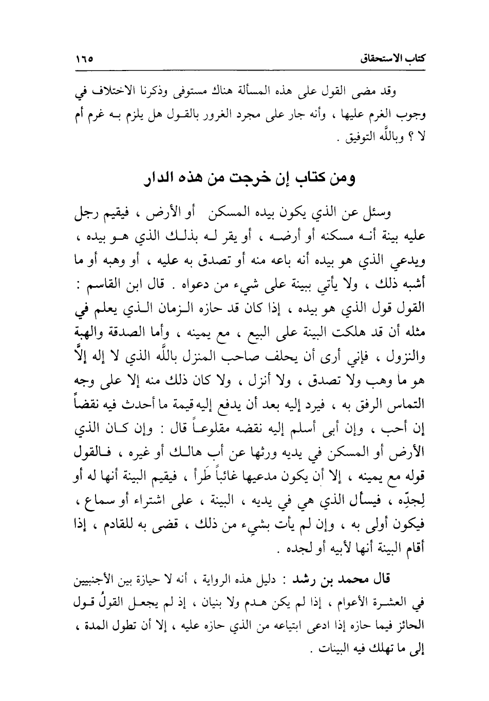 ومن كتاب إن خرجت من هذه الدار وسئل عن الذي يكون بيده المسكن أو الأرض، فيقيم رجل عليه بينة أنه مسكنه أو أرضه، أو يقر له بذلك الذي هو بيده، ويدعي الذي هو بيده أنه باعه منه أو تصدق به عليه، أو وهبه، أو ما أشبه ذلك، ولا يأتي ببينة على شيء من دعواه.