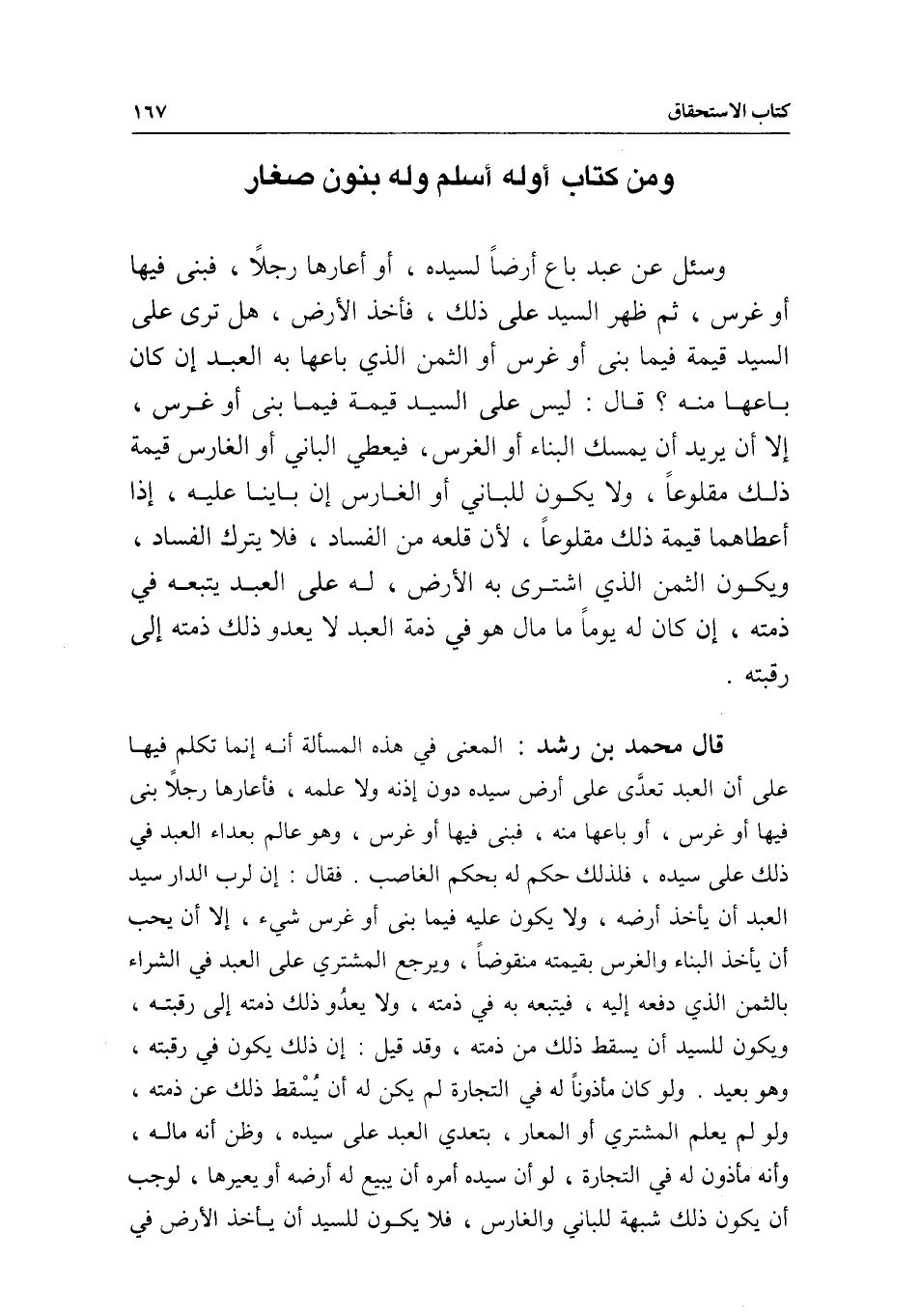 وسئل عن عبد باع أرضا لسيده، أو أعارها رجلا، فبنى فيها أو غرس، ثم ظهر السيد على ذلك، فأخذ الأرض، هل ترى على السيد قيمة فيما بنى أو غرس أو الثمن الذي باعها به العبد إن كان باعها منه؟ قال: ليس على السيد قيمة فيما بنى أو غرس، إلا أن يريد أن يمسك البناء أو الغرس، فيعطي الباني أو الغارس قيمة ذلك مقلوعا، ولا يكون للباني أو الغارس إن باينا عليه؛ إذا أعطاهما قيمة ذلك مقلوعا؛ لأن قلعه من الفساد، فلا يترك الفساد، ويكون الثمن الذي اشترى به الأرض، له على العبد يتبعه في ذمته، إن كان له يوما ما مال هو في ذمة العبد لا يعدو ذلك ذمته إلى رقبته.