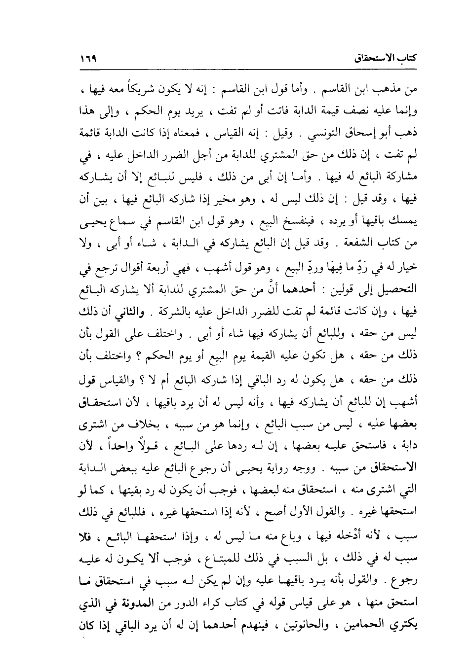 وأما قول ابن القاسم: إنه لا يكون شريكا معه فيها، وإنما عليه نصف قيمة الدابة فاتت أو لم تفت؛ يريد يوم الحكم، وإلى هذا ذهب أبو إسحاق التونسي. وقيل: إنه القياس، فمعناه إذا كانت الدابة قائمة لم تفت، إن ذلك من حق المشتري للدابة من أجل الضرر الداخل عليه في مشاركة البائع له فيها، وأما إن أبى من ذلك، فليس للبائع إلا أن يشاركه فيها، وقد قيل: إن ذلك ليس له، وهو مخير إذا شاركه البائع فيها، بين أن يمسك باقيها أو يرده، فينفسخ البيع، وهو قول ابن القاسم في سماع يحيى، من كتاب الشفعة.