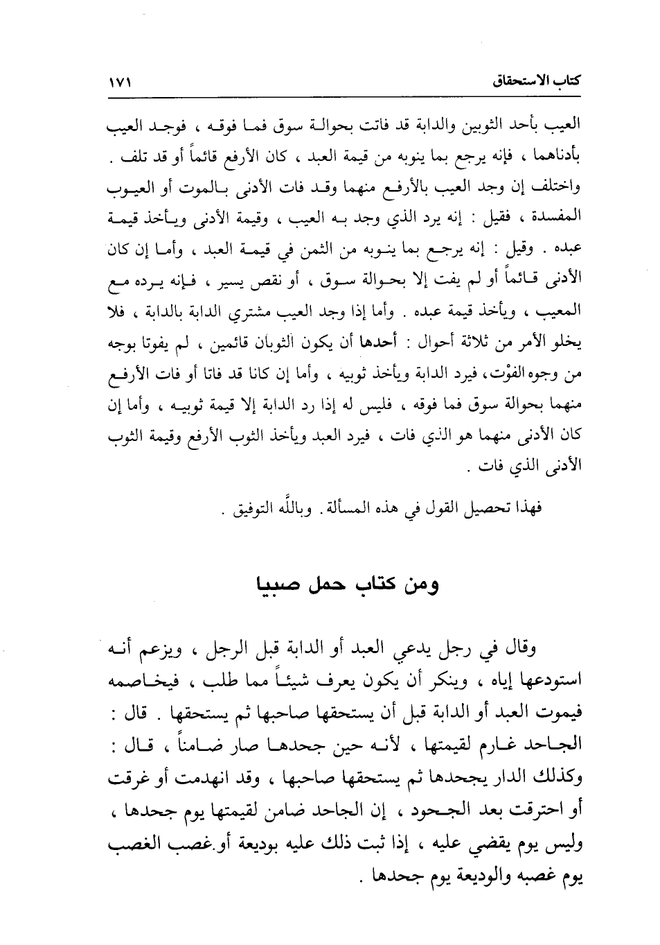 ومن كتاب حمل صبيا وقال في رجل يدعي العبد أو الدابة قبل الرجل، ويزعم أنه استودعها إياه، وينكر أن يكون يعرف شيئا مما طلب، فيخاصمه فيموت العبد أو الدابة قبل أن يستحقها صاحبها ثم يستحقها. قال: الجاحد غارم لقيمتها؛ لأنه حين جحدها صار ضامنا، قال: وكذلك الدار يجحدها ثم يستحقها صاحبها، وقد انهدمت أو غرقت أو احترقت بعد الجحود؛ أن الجاحد ضامن لقيمتها يوم جحدها، وليس يوم يقضى عليه؛ إذا ثبت ذلك عليه بوديعة أو غصب الغصب يوم غصبه، والوديعة يوم جحدها.