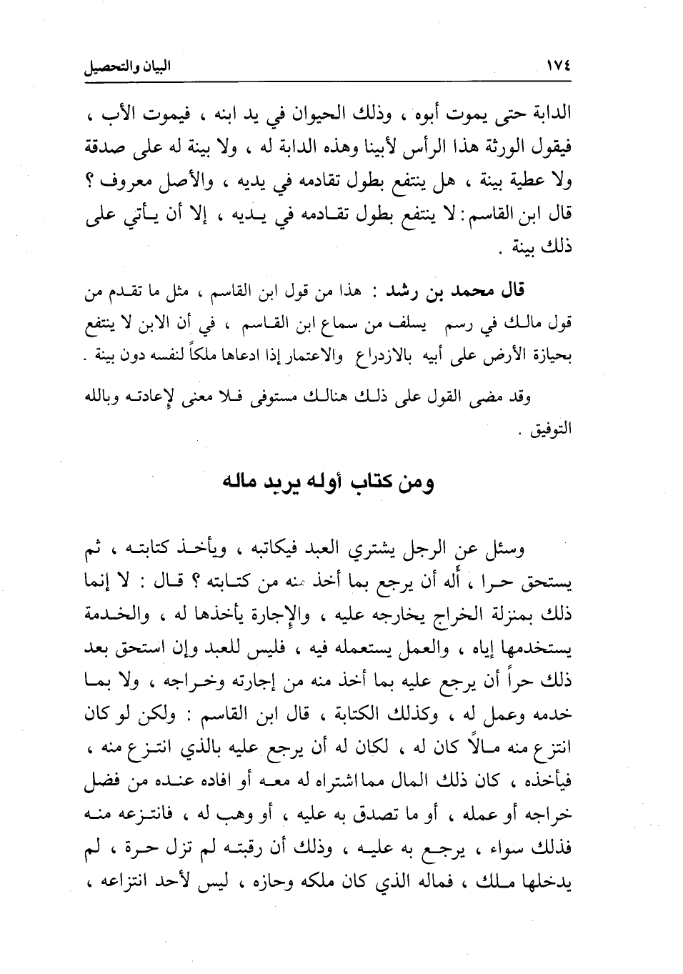 الدابة حتى يموت أبوه، وذلك الحيوان في يد ابنه، فيموت الأب، فيقول الورثة: هذا الرأس لأبينا، وهده الدابة له، ولا بينة له على صدقة ولا عطية بينة، هل ينتفع بطول تقادمه في يديه، والأصل معروف؟ قال ابن القاسم: لا ينتفع بطول تقادمه في يديه، إلا أن يأتي على ذلك بينة.