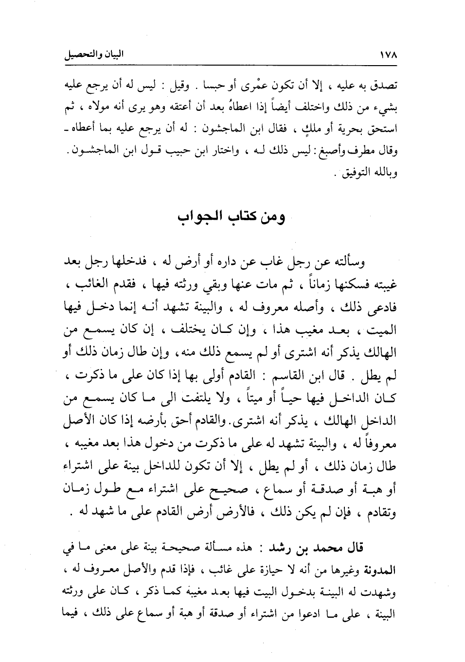 قال محمد بن رشد: هذه مسألة صحيحة بينة على معنى ما في المدونة وغيرها، من أنه لا حيازة على غائب، فإذا قدم والأصل معروف له، وشهدت له البينة بدخول البيت فيها بعد مغيبه كما ذكر، كان على ورثته البينة، على ما ادعوا من اشتراء أو صدقة أو هبة أو سماع على ذلك، فيما