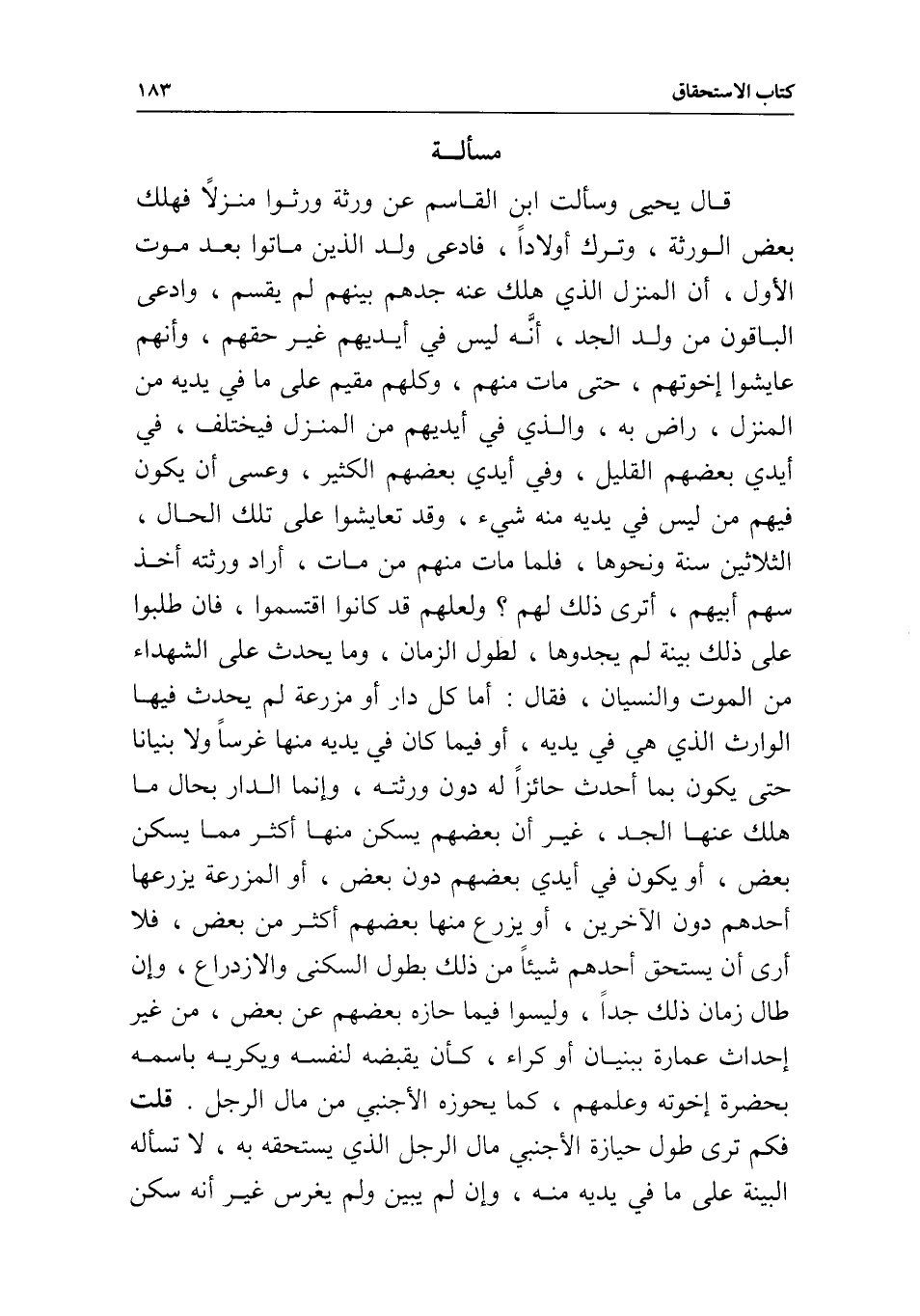 مسألة قال يحيى: وسألت ابن القاسم عن ورثة ورثوا منزلا، فهلك بعض الورثة، وترك أولادا، فادعى ولد الذين ماتوا بعد موت الأول، أن المنزل الذي هلك عنه جدهم بينهم لم يقسم، وادعى الباقون من ولد الجد، أنه ليس في أيديهم غير حقهم، وأنهم عايشوا إخوتهم، حتى مات منهم، وكلهم مقيم على ما في يديه من المنزل، راض به، والذي في أيديهم من المنزل، فيختلف في أيدي بعضهم القليل، وفي أيدي بعضهم الكثير، وعسى أن يكون فيهم من ليس في يديه منه شيء، وقد تعايشوا على تلك الحال، الثلاثين سنة ونحوها، فلما مات منهم من مات، أراد ورثته أخذ سهم أبيهم، أترى ذلك لهم؟ ولعلهم قد كانوا اقتسموا، فإن طلبوا على ذلك بينة لم يجدوها؛ لطول الزمان، وما يحدث على الشهداء من الموت والنسيان، فقال: أما كل دار أو مزرعة لم يحدث فيها الوارث الذي هي في يديه، أو فيما كان في يديه منها غرسا ولا بنيانا حتى يكون بما أحدث حائزا له دون ورثته، وإنما الدار بحال ما هلك عنها الجد، غير أن بعضهم يسكن منها أكثر مما يسكن بعض، أو يكون في أيدي بعضهم دون بعض، أو المزرعة يزرعها أحدهم دون الآخرين، أو يزرع منها بعضهم أكثر من بعض، فلا أرى أن يستحق أحدهم شيئا من ذلك بطول السكنى والازدراع، وإن طال زمان ذلك جدا، وليسوا فيما حازه بعضهم عن بعض، من غير إحداث عمارة ببنيان أو كراء، كأن يقبضه لنفسه ويكريه باسمه بحضرة إخوته وعلمهم، كما يحوزه الأجنبي من مال الرجل.