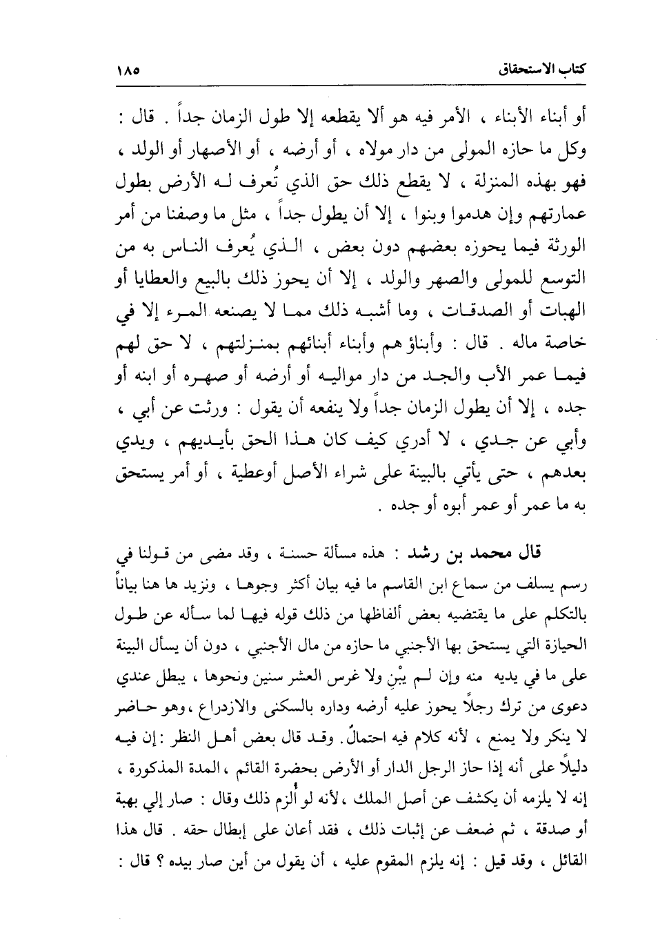 قال: وكل ما حازه المولى من دار مولاه، أو أرضه، أو الأصهار أو الولد، فهو بهذه المنزلة، لا يقطع ذلك حق الذي تعرف له الأرض بطول عمارتهم وإن هدموا وبنوا، إلا أن يطول جدا، مثل ما وصفنا من أمر الورثة فيما يحوزه بعضهم دون بعض، الذي يعرف الناس به من التوسع للمولى والصهر والولد، إلا أن يحوز ذلك بالبيع والعطايا أو الهبات أو الصدقات، وما أشبه ذلك مما لا يصنعه المرء إلا في خاصة ماله. قال: وأبناؤهم وأبناء أبنائهم بمنزلتهم، لا حق لهم فيما عمر الأب، والجد من دار مواليه أو أرضه أو داره أو ابنه أو جده، إلا أن يطول الزمان جدا، ولا ينفعه أن يقول: ورثت عن أبي، وأبي عن جدي، لا أدري كيف كان هذا الحق بأيديهم، ويدي بعدهم، حتى يأتي بالبينة على شراء الأصل أو عطية، أو أمر يستحق به ما عمر، أو عمر أبوه أو جده.