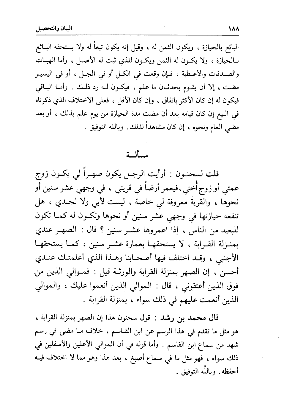 قال محمد بن رشد: قول سحنون هذا: إن الصهر بمنزلة القرابة، هو مثل ما تقدم في هذا الرسم عن ابن القاسم، خلاف ما مضى في رسم شهد، من سماع ابن القاسم. وأما قوله في أن الموالي الأعلين والأسفلين في ذلك سواء، فهو مثل ما في سماع أصبغ، بعد هذا، وهو مما لا اختلاف فيه أحفظه، وبالله التوفيق.