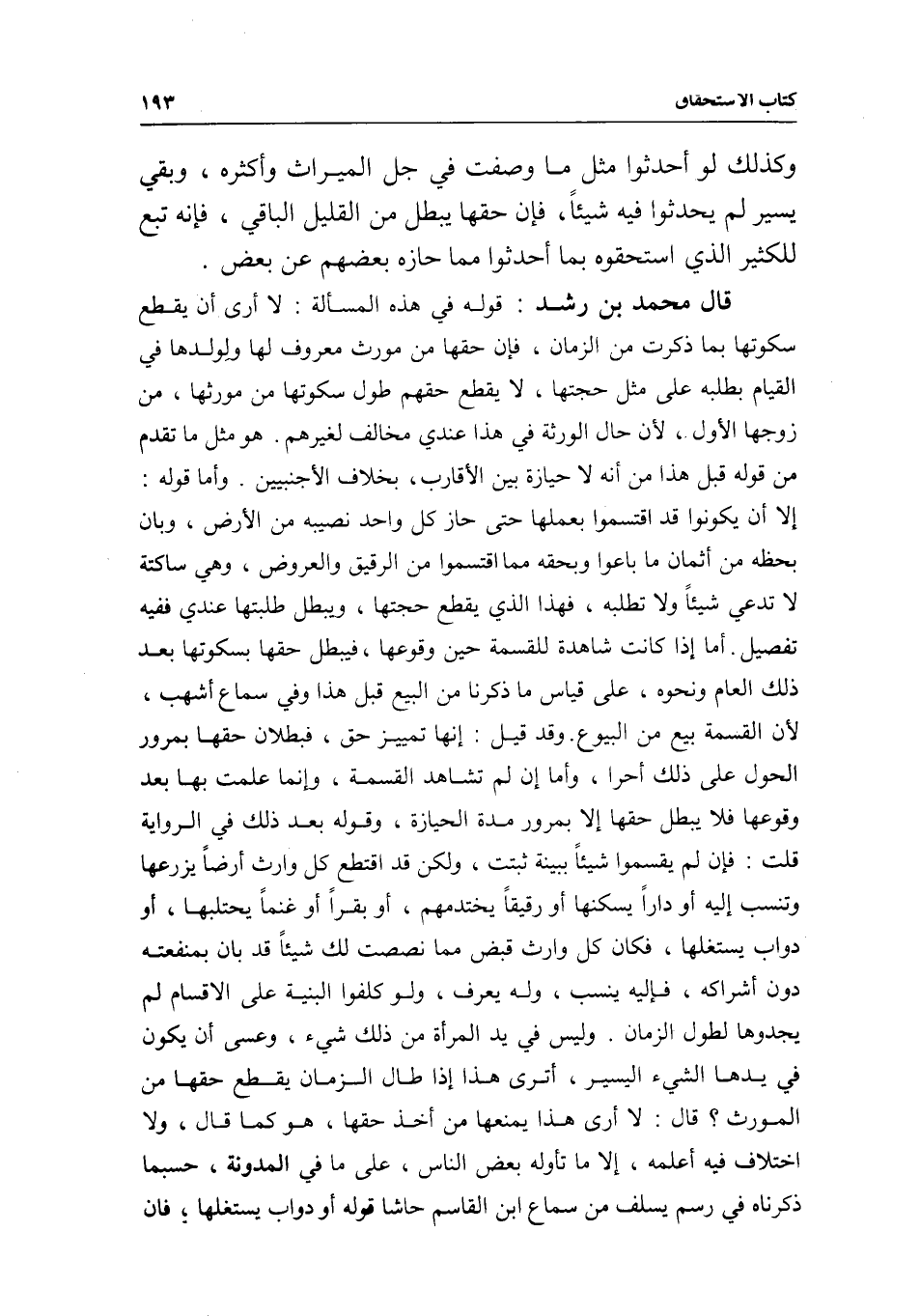 وكذلك لو أحدثوا مثل ما وصفت في جل الميراث وأكثره، وبقي يسير لم يحدثوا فيه شيئا، فإن حقها يبطل من القليل الباقي، فإنه تبع للكثير الذي استحقوه بما أحدثوا مما حازه بعضهم عن بعض.