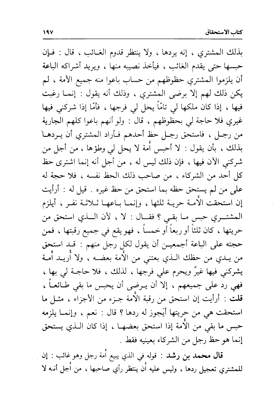 بذلك المشتري؛ أنه يردها، ولا ينتظر قدوم الغائب، قال: فإن حبسها حتى يقدم الغائب، فيأخذ نصيبه منها، ويريد أشراكه الباعة أن يلزموا المشتري حظوظهم من حساب باعوا منه جميع الأمة، لم يكن ذلك لهم إلا برضا المشتري، وذلك أنه يقول: إنما رغبت فيها؛ إذا كان ملكها لي تاما يحل لي فرجها، فأما إذا شركني فيها غيري، فلا حاجة لي بحظوظهم، قال: ولو أنهم باعوا كلهم الجارية من رجل، فاستحق رجل حظ أحدهم، فأراد المشتري أن يردها بذلك، بأن يقول: لا أحبس أمة لا يحل لي وطؤها، من أجل من شركني الآن فيها، فإن ذلك ليس له، من أجل أنه إنما اشترى حظ كل أحد من الشركاء، من صاحب ذلك الحظ نفسه، فلا حجة له على من لم يستحق حظه بما استحق من حظ غيره. قيل له: أرأيت إن استحقت الأمة حرية ثلثها، وإنما باعها ثلاثة نفر، أيلزم المشتري حبس ما بقي؟ فقال: لا؛ لأن الذي استحق من حريتها، كان ثلثا أو ربعا أو خمسا، فهو يقع في جميع رقبتها، فمن حجته على الباعة أجمعين أن يقول لكل رجل منهم: قد استحق من يدي من حظك الذي بعتني من الأمة بعضه، ولا أريد أمة يشركني فيها غير ويحرم علي فرجها، لذلك، فلا حاجة لي بها، فهي رد على جميعهم، إلا أن يرضى أن يحبس ما بقي طائعا، قلت: أرأيت إن استحق من رقبة الأمة جزء من الأجزاء، مثل ما استحقت هي من حريتها، أيجوز له ردها؟ قال: نعم، وإنما يلزمه حبس ما بقي من الأمة إذا استحق بعضها؛ إذا كان الذي يستحق إنما هو حظ رجل من الشركاء بعينيه فقط.