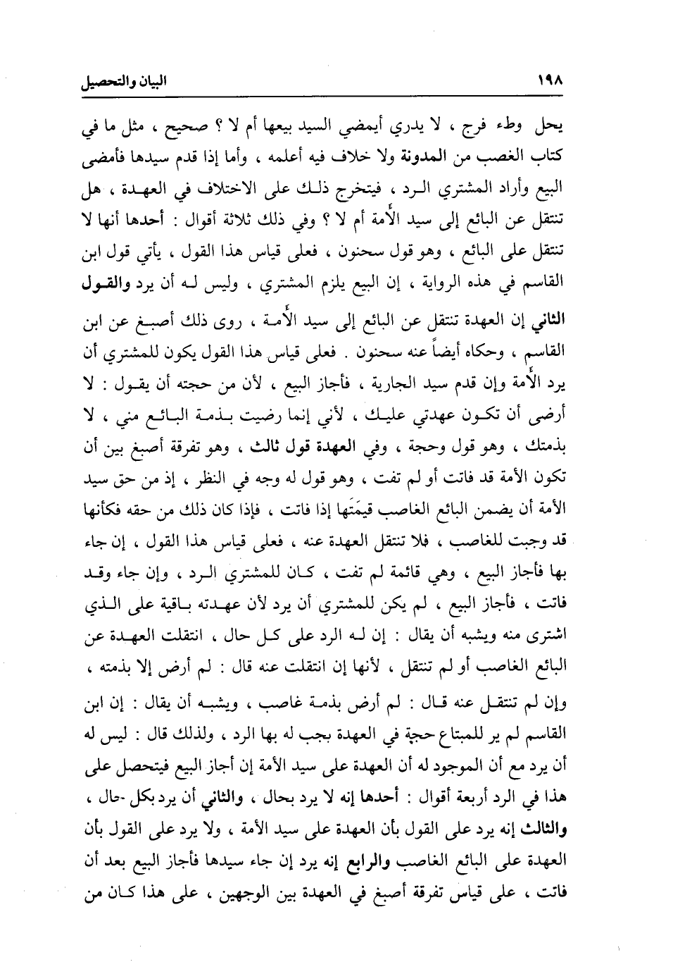 والقول الثاني: إن العهدة تنتقل عن البائع إلى سيد الأمة، روى ذلك أصبغ عن ابن القاسم، وحكاه أيضا عنه سحنون. فعلى قياس هذا القول يكون للمشتري أن يرد الأمة، وإن قدم سيد الجارية، فأجاز البيع؛ لأن من حجته أن يقول: لا أرضى أن تكون عهدتي عليك؛ لأني إنما رضيت بذمة البائع مني، لا بذمتك، وهو قول وحجة، وفي العهدة قول ثالث، وهو تفرقة أصبغ بين أن تكون الأمة، قد فاتت أو لم تفت، وهو قول له وجه في النظر؛ إذ من حق سيد الأمة أن يضمن البائع الغاصب قيمتها إذا فاتت، فإذا كان ذلك من حقه، فكأنها قد وجبت للغاصب، فلا تنتقل العهدة عنه، فعلى قياس هذا القول، إن جاء بها فأجاز البيع، وهي قائمة لم تفت، كان للمشتري الرد، وإن جاء وقد فاتت، فأجاز البيع، لم يكن للمشتري أن يرد؛ لأن عهدته باقية على الذي اشترى منه ويشبه أن يقال: إن له الرد على كل حال، انتقلت العهدة عن البائع الغاصب أو لم تنتقل؛ لأنها إن انتقلت عنه قال: لم أرض إلا بذمته، وإن لم تنتقل عنه قال: لم أرض بذمة غاصب، ويشبه أن يقال: إن ابن القاسم لم ير للمبتاع حجة في العهدة؛ يجب له بها الرد، ولذلك قال: ليس له أن يرد مع أن الموجود له أن العهدة على سيد الأمة إن أجاز البيع، فيتحصل على هذا في الرد أربعة أقوال؛ أحدها: أنه لا يرد بحال. والثاني: أن يرد بكل حال. والثالث: أنه يرد على القول بأن العهدة على سيد الأمة، ولا يرد على القول بأن العهدة على البائع الغاصب. والرابع: أنه يرد إن جاء سيدها، فأجاز البيع بعد أن فاتت، على قياس تفرقة أصبغ في العهدة بين الوجهين، على هذا كان من