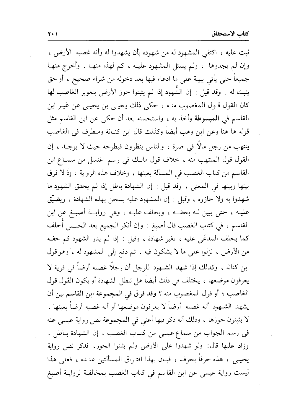 وقد فرق في المجموعة ابن القاسم بين أن يشهد الشهود أنه غصبه أرضا لا يعرفون موضعها، أو أنه غصبه أرضا بعينها، لا يثبتون حوزها، وذلك أنه ذكر فيها أعني في المجموعة نص رواية عيسى عنه، في رسم الجواب، من سماع عيسى من كتاب الغصب؛ أن الشهادة باطل، وزاد عليها قال: ولو شهدوا على الأرض ولم يثبتوا الحوز، فذكر نص رواية يحيى، هذه حرفا بحرف، فبان بهذا افتراق المسألتين عنده، فعلى هذا ليست رواية عيسى عن ابن القاسم في كتاب الغصب بمخالفة لرواية أصبغ