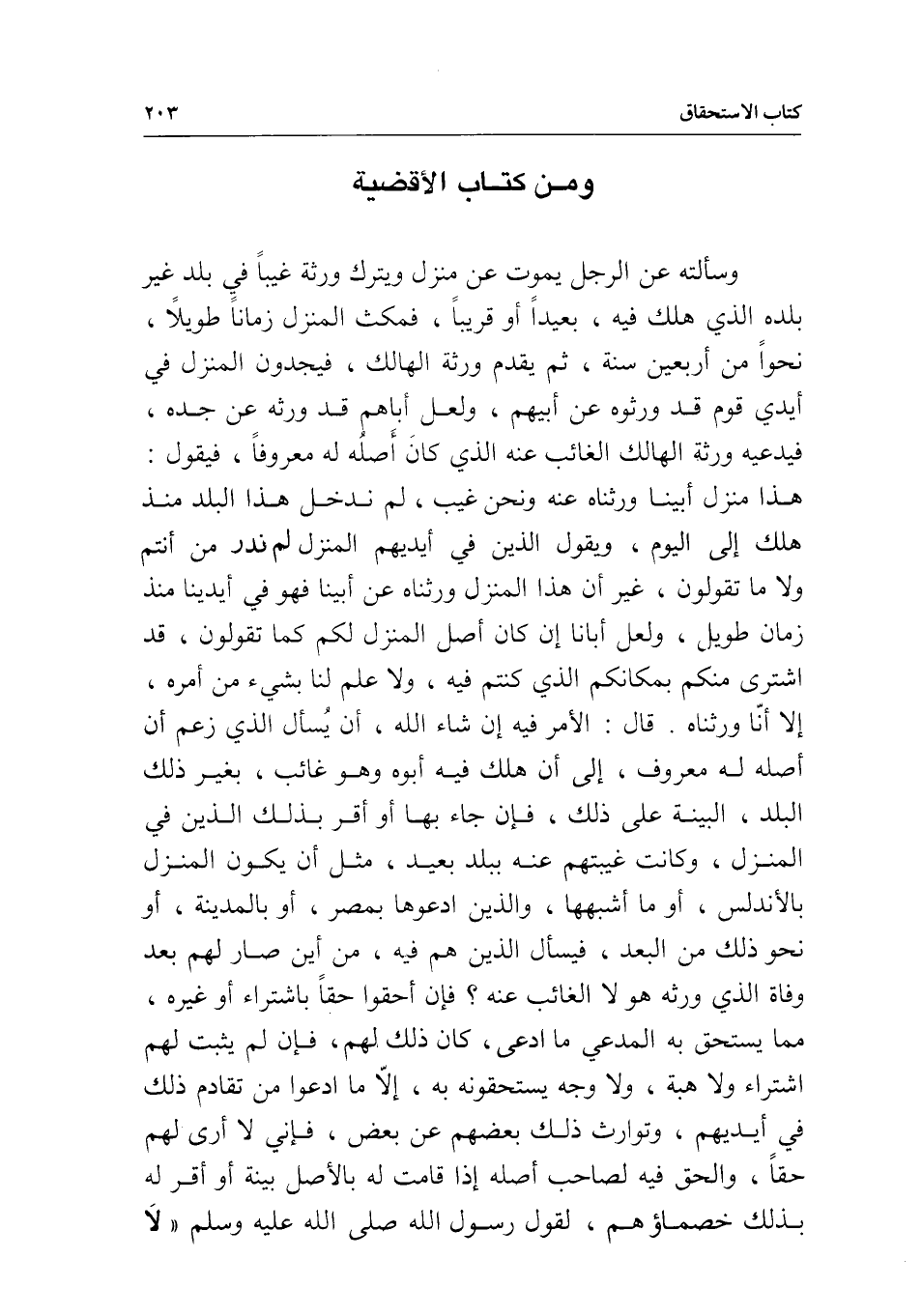 ومن كتاب الأقضية وسألته عن الرجل يموت عن منزل ويترك ورثة غيبا في بلد غير بلده الذي هلك فيه، بعيدا أو قريبا، فمكث المنزل زمانا طويلا، نحوا من أربعين سنة، ثم يقدم ورثة الهالك، فيجدون المنزل في أيدي قوم قد ورثوه عن أبيهم، ولعل أباهم قد ورثه عن جده، فيدعيه ورثة الهالك الغائب عنه الذي كان أصله له معروفا، فيقول: هذا منزل أبينا، ورثناه عنه ونحن غيب، لم ندخل هذا البلد منذ هلك إلى اليوم، ويقول الذين في أيديهم المنزل: لم ندر من أنتم، ولا ما تقولون، غير أن هذا المنزل ورثناه عن أبينا، فهو في أيدينا منذ زمن طويل، ولعل أبانا إن كان أصل المنزل لكم كما تقولون، قد اشترى منكم بمكانكم الذي كنتم فيه، ولا علم لنا بشيء من أمره، إلا أنا ورثناه. قال: الأمر فيه إن شاء الله، أن يسأل الذي زعم أن أصله له معروف، إلى أن هلك فيه أبوه وهو غائب، بغير ذلك البلد، البينة على ذلك، فإن جاء بها أو أقر بذلك الذين في المنزل، وكانت غيبتهم عنه ببلد بعيد، مثل أن يكون المنزل بالأندلس، أو ما أشبهها، والذين ادعوها بمصر، أو بالمدينة، أو نحو ذلك من البعد، فيسأل الذين هم فيه، من أين صار لهم بعد وفاة الذي ورثه هو لا الغائب عنه؟