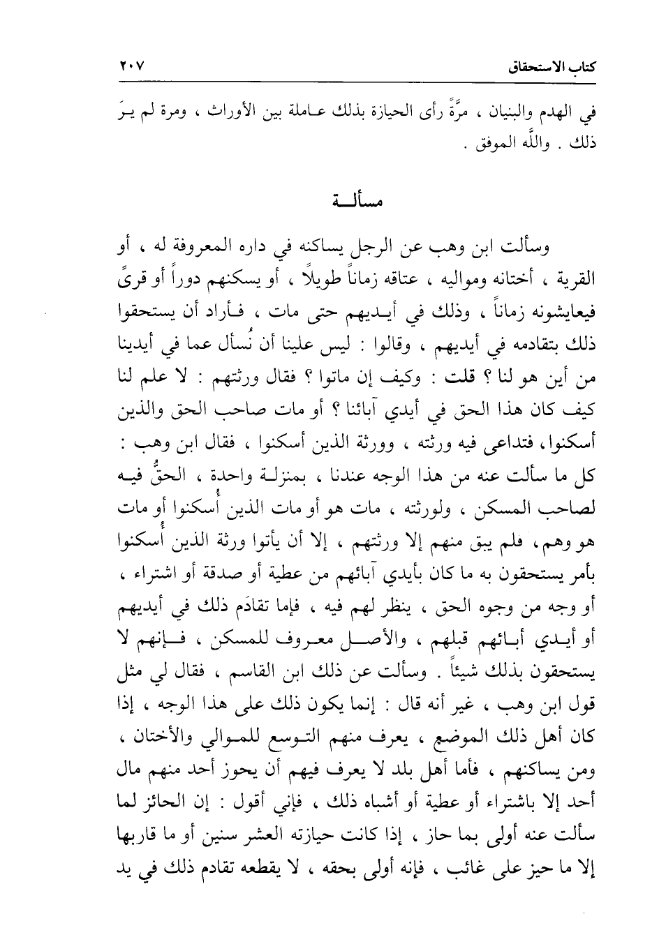مسألة وسألت ابن وهب عن الرجل يساكنه في داره المعروفة له، أو القرية، أختانه ومواليه، عتاقه زمانا طويلا، أو يسكنهم دورا أو قرى فيعايشونه زمانا، وذلك في أيديهم حتى مات، فأراد أن يستحقوا ذلك بتقادمه في أيديهم، وقالوا: ليس علينا أن نسأل عما في أيدينا من أين هو لنا؟ قلت: وكيف إن ماتوا؟ فقال ورثتهم: لا علم لنا كيف كان هذا الحق في أيدي آبائنا؟ أو مات صاحب الحق والذين أسكنوا، فتداعى فيه ورثته، وورثة الذين أسكنوا، فقال ابن وهب: كل ما سألت عنه من هذا الوجه عندنا، بمنزلة واحدة، الحق فيه لصاحب المسكن، ولورثته، مات هو أو مات الذين أسكنوا أو مات هو وهم، فلم يبق منهم إلا ورثتهم، إلا أن يأتوا ورثة الذين أسكنوا بأمر يستحقون به ما كان بأيدي آبائهم من عطية أو صدقة أو اشتراء، أو وجه من وجوه الحق، ينظر لهم فيه، فإما تقادم ذلك في أيديهم أو أيدي آبائهم قبلهم، والأصل معروف للمسكن، فإنهم لا يستحقون بذلك شيئا. وسألت عن ذلك ابن القاسم، فقال لي مثل قول ابن وهب، غير أنه قال: إنما يكون ذلك على هذا الوجه؛ إذا كان أهل ذلك الموضع، يعرف منهم التوسع للموالي والأختان، ومن يساكنهم، فأما أهل بلد لا يعرف فيهم أن يحوز أحد منهم مال أحد إلا باشتراء أو عطية أو أشباه ذلك، فإني أقول: إن الحائز لما سألت عنه أولى بما حاز؛ إذا كانت حيازته العشر سنين أو ما قاربها إلا ما حيز على غائب، فإنه أولى بحقه، لا يقطعه تقادم ذلك في يد