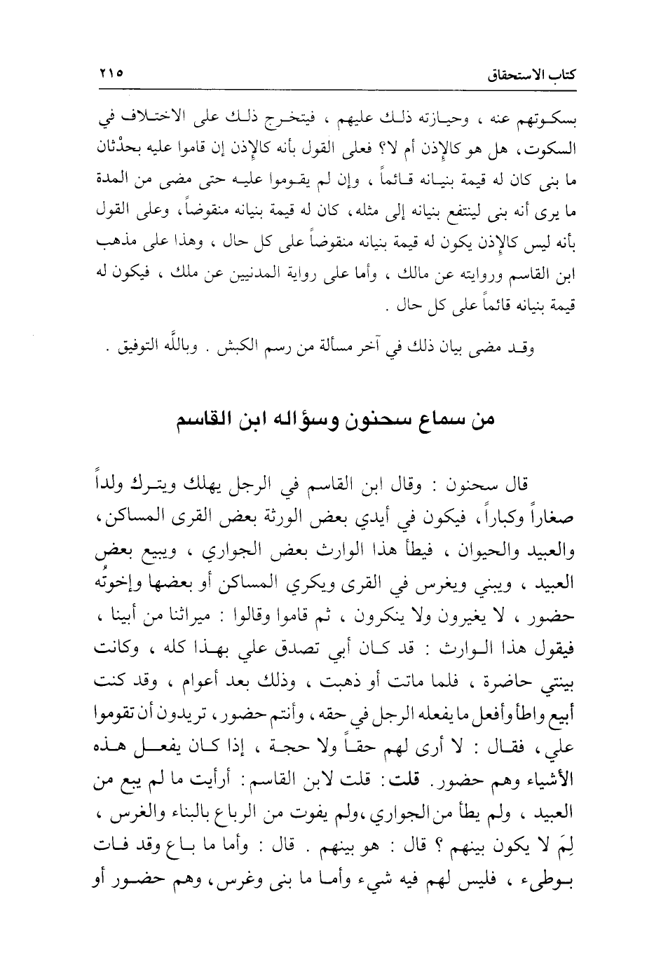 من سماع سحنون وسؤاله ابن القاسم قال سحنون: وقال ابن القاسم في الرجل يهلك ويترك ولدا صغارا وكبارا، فيكون في أيدي بعض الورثة بعض القرى المساكن، والعبيد والحيوان، فيطأ هذا الوارث بعض الجواري، ويبيع بعض العبيد، ويبني ويغرس في القرى، ويكري المساكن أو بعضها وإخوته حضور، لا يغيرون ولا ينكرون، ثم قاموا وقالوا: ميراثنا من أبينا، فيقول هذا الوارث: قد كان أبي تصدق علي بهذا كله، وكانت بينتي حاضرة، فلما ماتت أو ذهبت، وذلك بعد أعوام، وقد كنت أبيع وأطأ وأفعل ما يفعله الرجل في حقه، وأنتم حضور، تريدون أن تقوموا علي، فقال: لا أرى لهم حقا ولا حجة؛ إذا كان يفعل هذه الأشياء وهم حضور. قلت: قلت لابن القاسم: أرأيت ما لم يبع من العبيد، ولم يطأ من الجواري، ولم يفوت من الرباع بالبناء والغرس، لم لا يكون بينهم؟ قال: هو بينهم. قال: وأما ما باع وقد فات بوطء، فليس لهم فيه شيء وأما ما بنى وغرس، وهم حضور أو