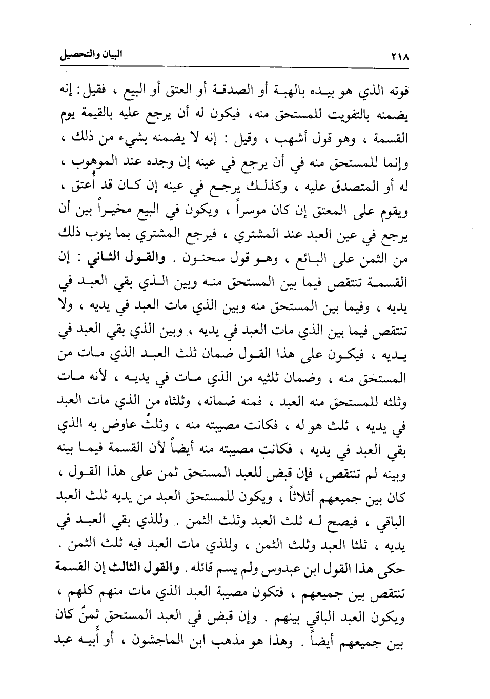 والقول الثاني: إن القسمة تنتقص فيما بين المستحق منه، وبين الذي بقي العبد في يديه، وفيما بين المستحق منه، وبين الذي مات العبد في يديه، ولا تنتقص فيما بين الذي مات العبد في يديه، وبين الذي بقي العبد في يديه، فيكون على هذا القول ضمان ثلث العبد الذي مات من المستحق منه، وضمان ثلثيه من الذي مات في يديه؛ لأنه مات وثلثه للمستحق منه العبد، فمنه ضمانه، وثلثاه من الذي مات العبد في يديه، ثلث هو له، فكانت مصيبته منه، وثلث عاوض به الذي بقي العبد في يديه، فكانت مصيبته منه أيضا؛ لأن القسمة فيما بينه وبين لم تنتقص، فإن قبض للعبد المستحق ثمن على هذا القول، كان بين جميعهم أثلاثا، ويكون للمستحق العبد من يديه ثلث العبد الباقي، فيصح له ثلث العبد، وثلث الثمن. وللذي بقي العبد في يديه، ثلثا العبد وثلث الثمن، وللذي مات العبد فيه ثلث الثمن. حكى هذا القول ابن عبدوس، ولم يسم قائله.