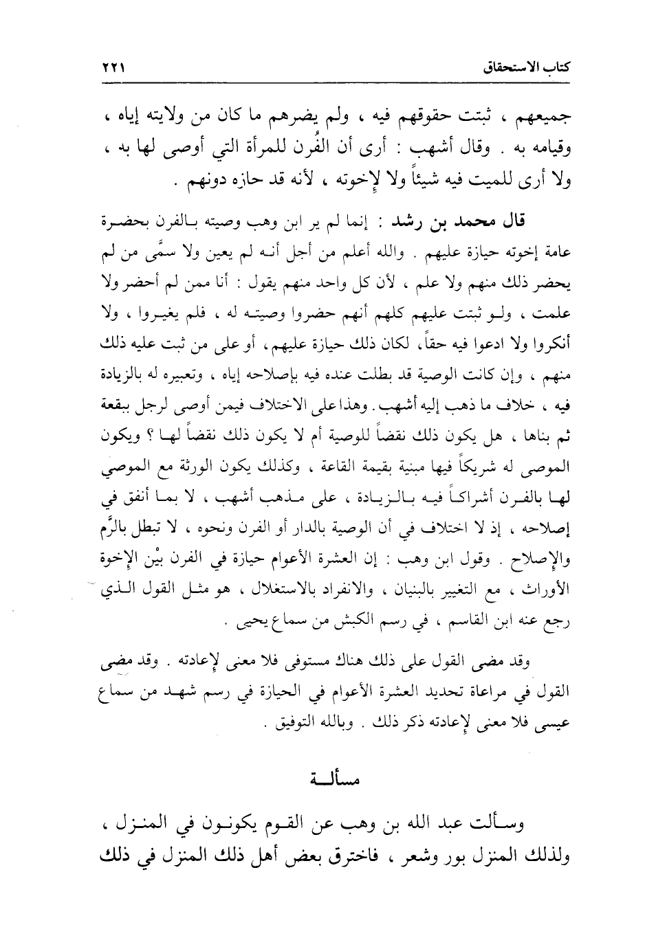 قال محمد بن رشد: إنما لم ير ابن وهب وصيته بالفرن بحضرة عامة إخوته حيازة عليهم، والله أعلم من أجل أنه لم يعين ولا سمى من لم يحضر ذلك منهم ولا علم؛ لأن كل واحد منهم يقول: أنا ممن لم أحضر ولا علمت، ولو ثبتت عليهم كلهم أنهم حضروا وصيته له، فلم يغيروا، ولا أنكروا ولا ادعوا فيه حقا؛ لكان ذلك حيازة عليهم، أو على من ثبت عليه ذلك منهم، وإن كانت الوصية قد بطلت عنده فيه بإصلاحه إياه، وتعبيره له بالزيادة فيه، خلاف ما ذهب إليه أشهب.