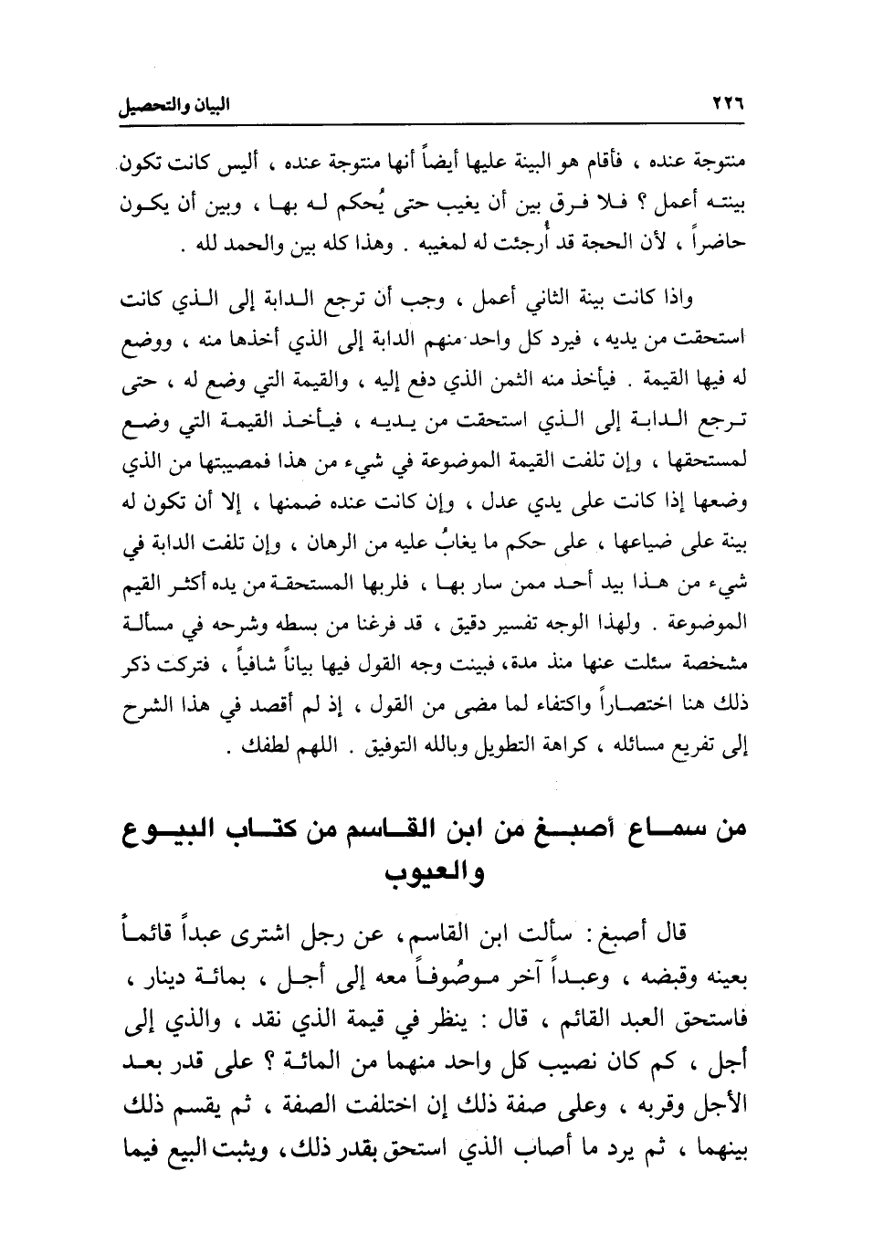 من سماع أصبغ من ابن القاسم من كتاب البيوع والعيوب قال أصبغ: سألت ابن القاسم عن رجل اشترى عبدا قائما بعينه وقبضه، وعبدا آخر موصوفا معه إلى أجل، بمائة دينار، فاستحق العبد القائم، قال: ينظر في قيمة الذي نقد، والذي إلى أجل، كم كان نصيب كل واحد منهما من المائة؟ على قدر بعد الأجل وقربه، وعلى صفة ذلك إن اختلفت الصفة، ثم يقسم ذلك بينهما، ثم يرد ما أصاب الذي استحق بقدر ذلك، ويثبت البيع فيما