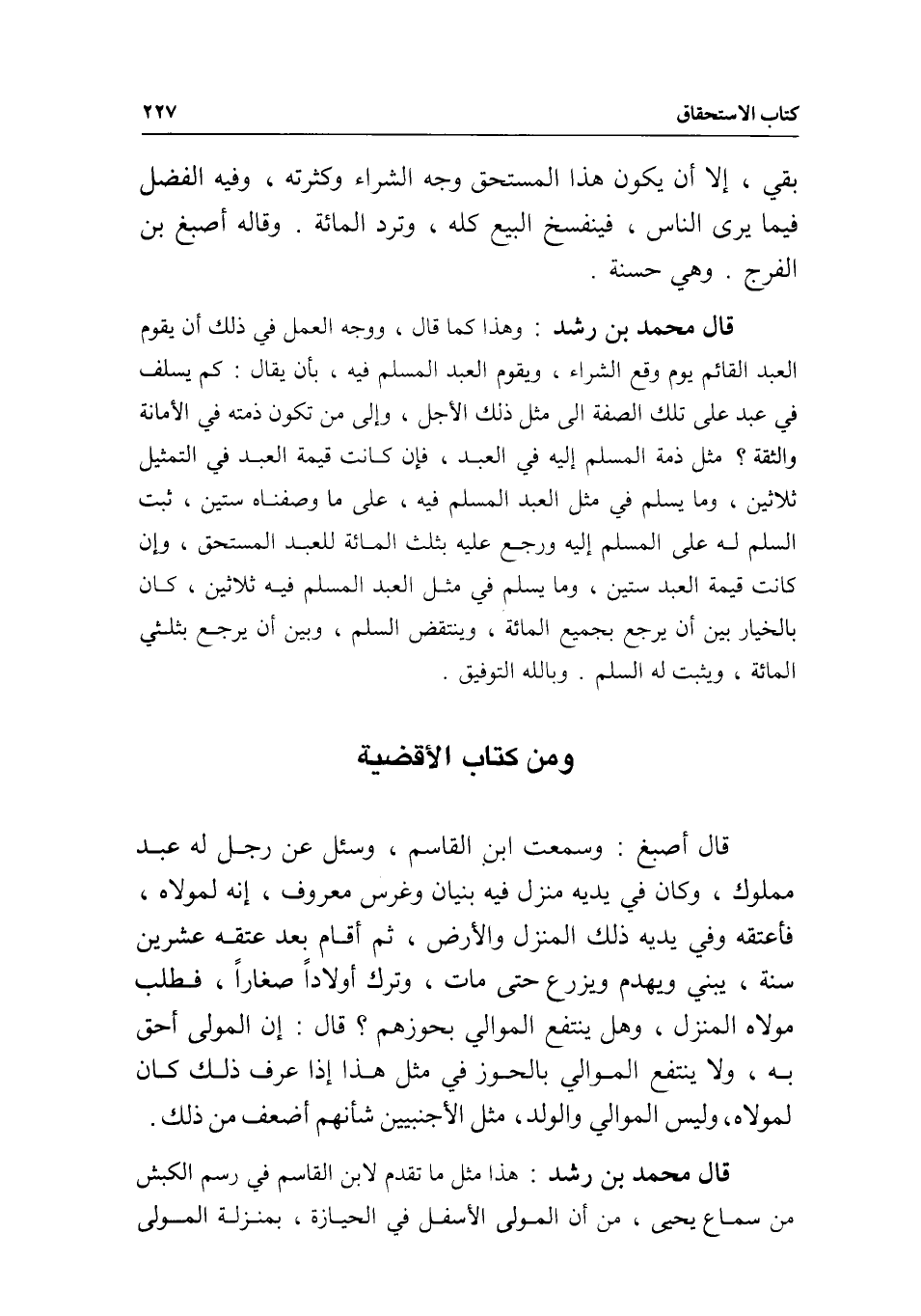 ومن كتاب الأقضية قال أصبغ: وسمعت ابن القاسم، وسئل عن رجل له عبد مملوك، وكان في يديه منزل فيه بنيان وغرس معروف؛ إنه لمولاه، فأعتقه وفي يديه ذلك المنزل والأرض، ثم أقام بعد عتقه عشرين سنة، يبني ويهدم ويزرع حتى مات، وترك أولادا صغارا، فطلب مولاه المنزل، وهل ينتفع الموالي بحوزهم؟ قال: إن المولى أحق به، ولا ينتفع الموالي بالحوز في مثل هذا إذا عرف ذلك كان لمولاه، وليس الموالي والولد مثل الأجنبيين، شأنهم أضعف من ذلك.
