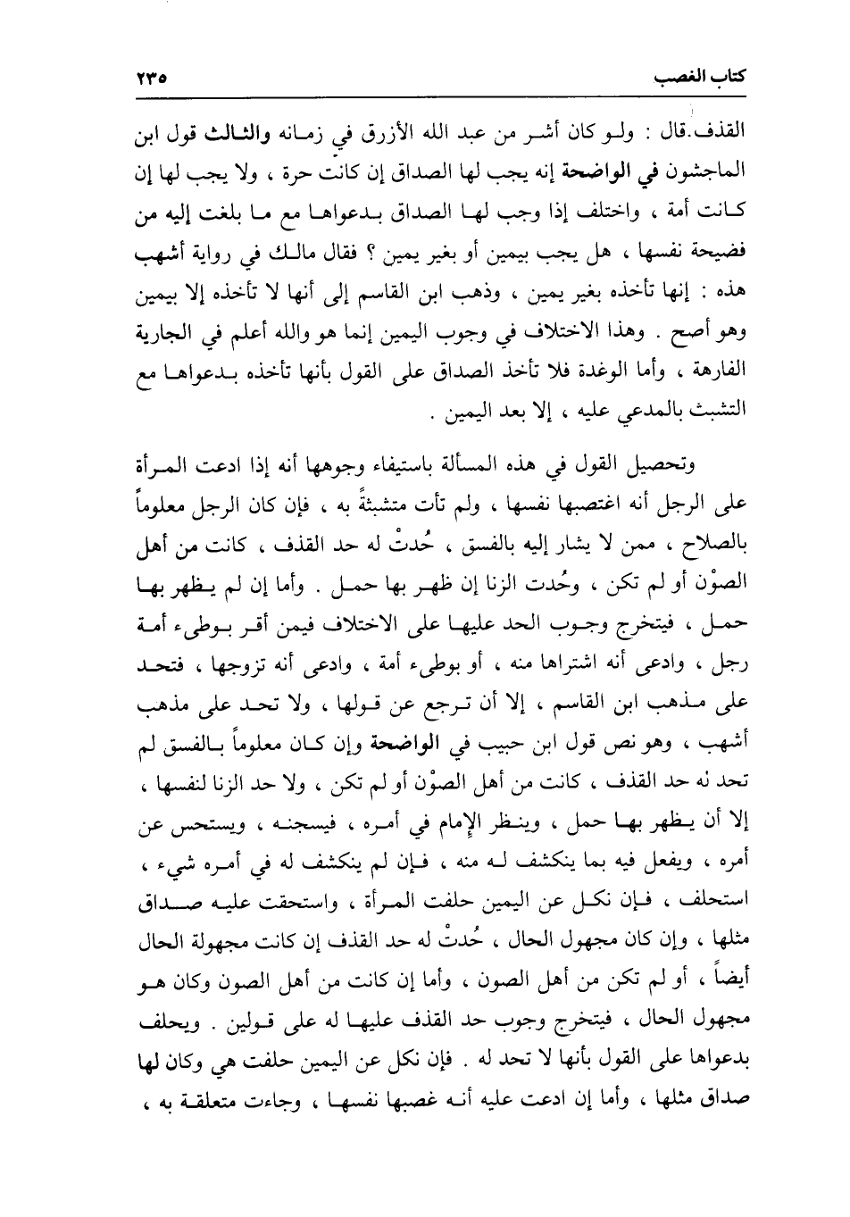 القذف. قال: ولو كان أشر من عبد الله الأزرق في زمانه. والثالث قول ابن الماجشون في الواضحة: أنه يجب لها الصداق إن كانت حرة، ولا يجب لها إن كانت أمة، واختلف إذا وجب لها الصداق بدعواها مع ما بلغت إليه من فضيحة نفسها، هل يجب بيمين أو بغير يمين؟ فقال مالك في رواية أشهب هذه: إنها تأخذه بغير يمين، وذهب ابن القاسم إلى أنها لا تأخذه إلا بيمين وهو أصح. وهذا الاختلاف في وجوب اليمين إنما هو والله أعلم في الجارية الفارهة، وأما الوغدة فلا تأخذ الصداق على القول بأنها تأخذه بدعواها مع التشبث بالمدعى عليه، إلا بعد اليمين.