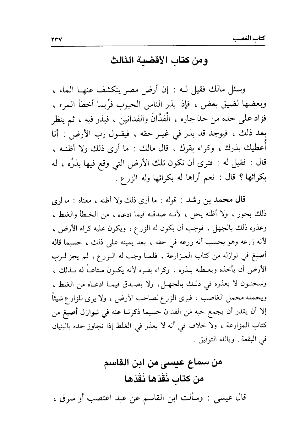 ومن كتاب الأقضية الثالث وسئل مالك فقيل له: إن أرض مصر ينكشف عنها الماء، وبعضها لضيق بعض، فإذا بذر الناس الحبوب فربما أخطأ المرء، فزاد على حده من حد جاره، الفدان والفدانين، فبذر فيه، ثم ينظر بعد ذلك، فيوجد قد بذر في غير حقه، فيقول رب الأرض: أنا أعطيك بذرك، وكراء بقرك، قال مالك: ما أرى ذلك ولا أظنه، قال: فقيل له: فترى أن تكون تلك الأرض التي وقع فيها بذره له بكرائها؟ قال: نعم، أراها له بكرائها، وله الزرع.