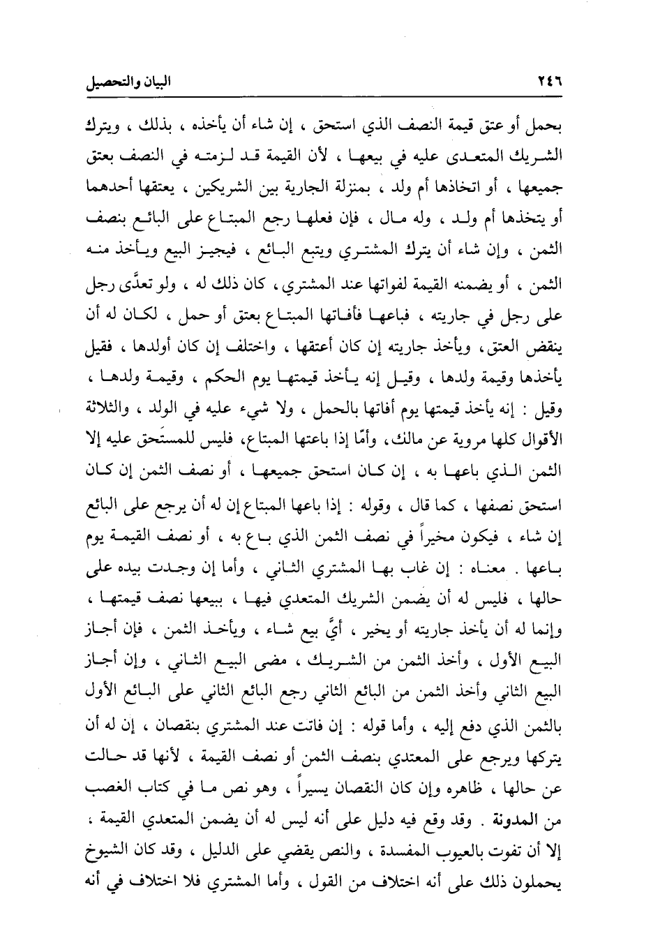 وأما قوله: إن فاتت عند المشتري بنقصان؛ أن له أن يتركها ويرجع على المعتدي بنصف الثمن أو نصف القيمة؛ لأنها قد حالت عن حالها، ظاهره وإن كان النقصان يسيرا، وهو نص ما في كتاب الغصب من المدونة. وقد وقع فيه دليل على أنه ليس له أن يضمن المتعدي القيمة؛ إلا أن تفوت بالعيوب المفسدة، والنص يقضي على الدليل، وقد كان الشيوخ يحملون ذلك على أنه اختلاف من القول، وأما المشتري فلا اختلاف في أنه