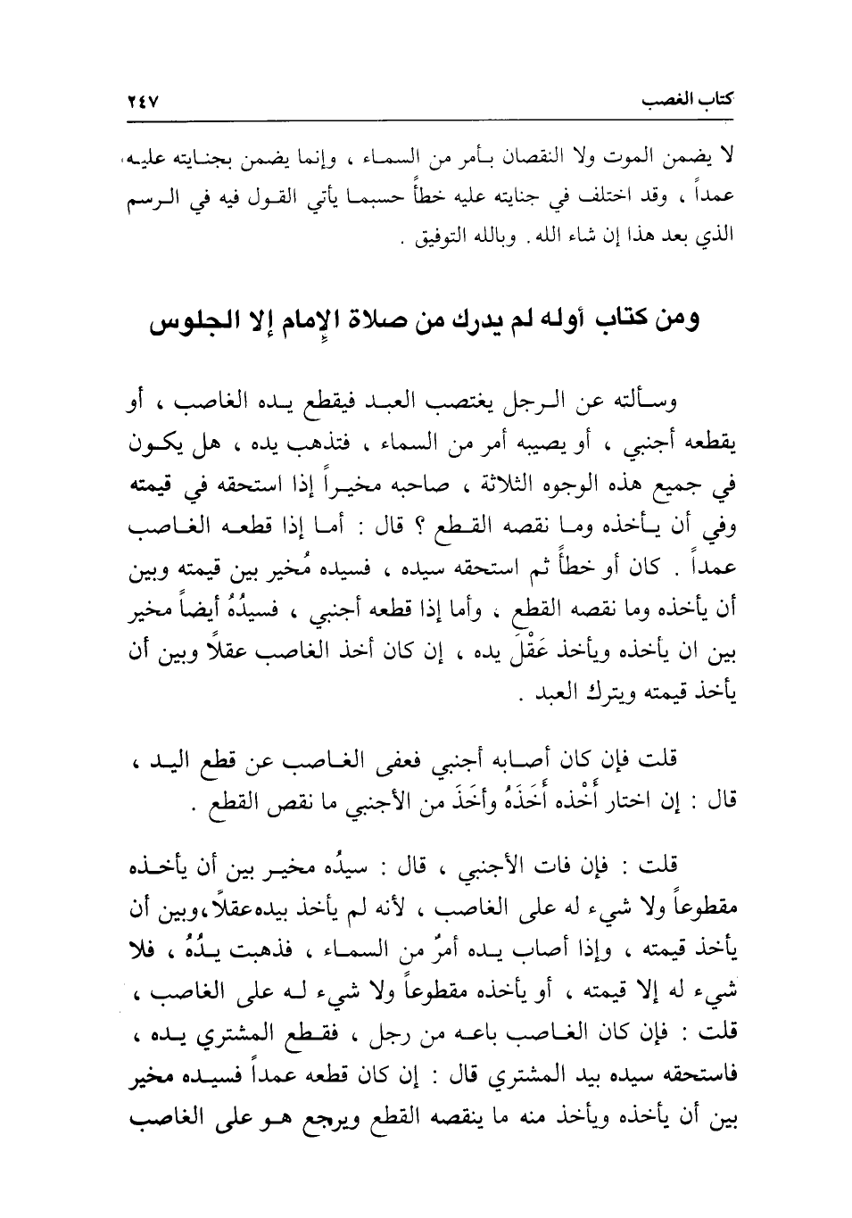 ومن كتاب أوله لم يدرك من صلاة الإمام إلا الجلوس وسألته عن الرجل يغتصب العبد فيقطع يده الغاصب، أو يقطعه أجنبي، أو يصيبه أمر من السماء، فتذهب يده، هل يكون في جميع هذه الوجوه الثلاثة، صاحبه مخيرا إذا استحقه في قيمته وفي أن يأخذه وما نقصه القطع؟ قال: أما إذا قطعه الغاصب عمدا كان أو خطأ، ثم استحقه سيده، فسيده مخير بين قيمته وبين أن يأخذه وما نقصه القطع؛ وأما إذا قطعه أجنبي، فسيده أيضا مخير بين أن يأخذه ويأخذ عقل يده، إن كان أخذ الغاصب عقلا، وبين أن يأخذ قيمته ويترك العبد.