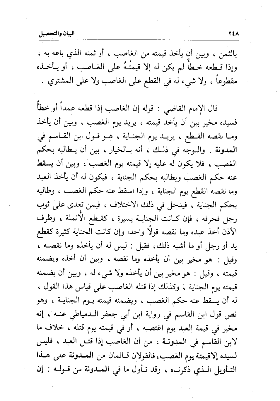 قال الإمام القاضي: قوله: إن الغاصب إذا قطعه عمدا أو خطأ، فسيده مخير بين أن يأخذ قيمته، يريد يوم الغصب، وبين أن يأخذ وما نقصه القطع، يريد يوم الجناية، هو قول ابن القاسم في المدونة. والوجه في ذلك، أنه بالخيار بين أن يطالبه بحكم الغصب، فلا يكون له عليه إلا قيمته يوم الغصب، وبين أن يسقط عنه حكم الغصب ويطالبه بحكم الجناية، فيكون له أن يأخذ العبد، وما نقصه القطع يوم الجناية، وإذا أسقط عنه حكم الغصب، وطالبه بحكم الجناية، فيدخل في ذلك الاختلاف، فيمن تعدى على ثوب رجل فحرقه، فإن كانت الجناية يسيرة، كقطع الأنملة، وطرف الأذن أخذ عبده، وما نقصه قولا واحدا، وإن كانت الجناية كثيرة كقطع يد أو رجل أو ما أشبه ذلك، فقيل: ليس له أن يأخذه وما نقصه، وقيل: هو مخير بين أن يأخذه وما نقصه، وبين أن أخذه ويضمنه قيمته.